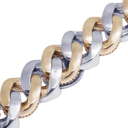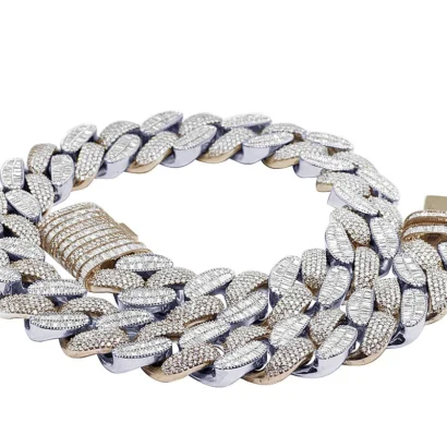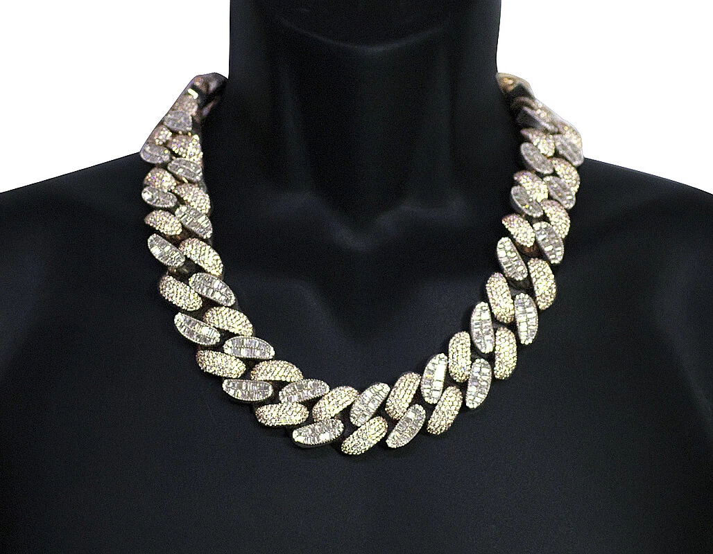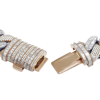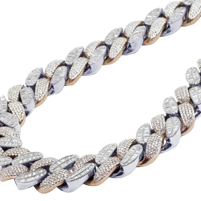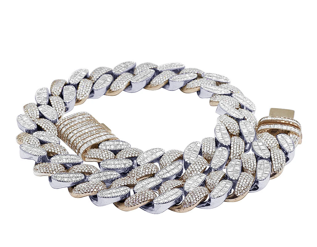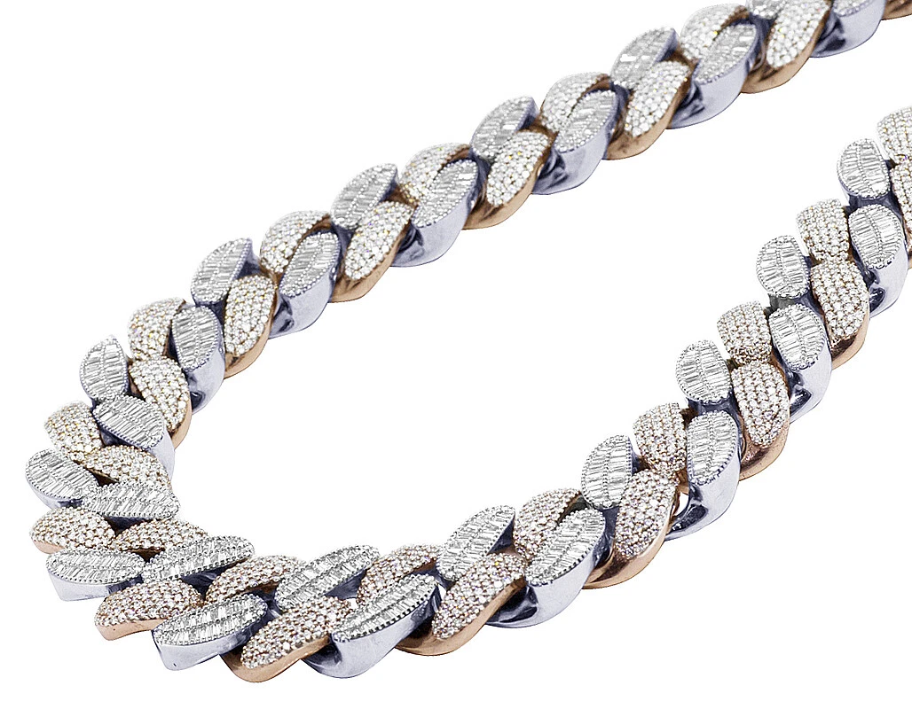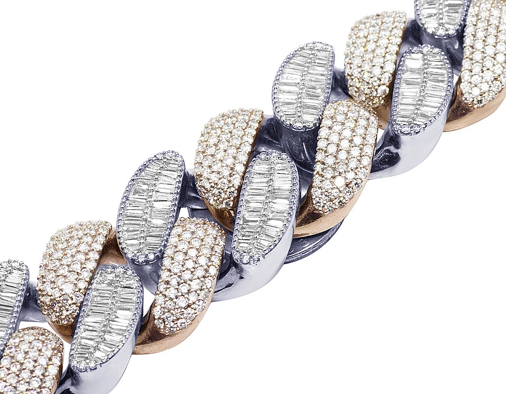 Distinct and stunning this lavish Cuban Necklace will upgrade anyone’s style and be an eyecatcher wherever you go. This Cuban Necklace is beautifully crafted in 10K Two Tone Rose White Gold and stunning 92.65 CT diamonds. This Necklace is made with exquisite craftsmanship and is perfect for all occasions. The Necklace carries elegant Baguette cut diamonds and rows of round diamonds in each of its alternate links. This exemplary bracelet dazzles with excellent-cut genuine diamonds of VS1-VS2 clarity and G-H color. This exemplary 25mm Cuban is 22 inches in length and approximately 763 grams. Featuring a beautifully crafted fold-over clasp with alternate 2 rows of each Baguette and Round Cut diamonds for a secure and luxurious fit.