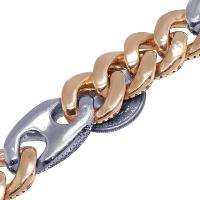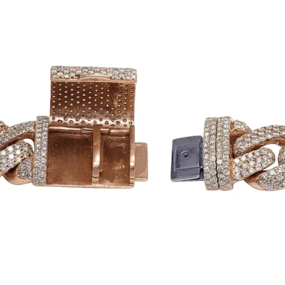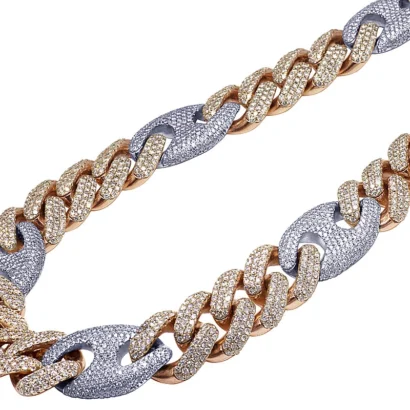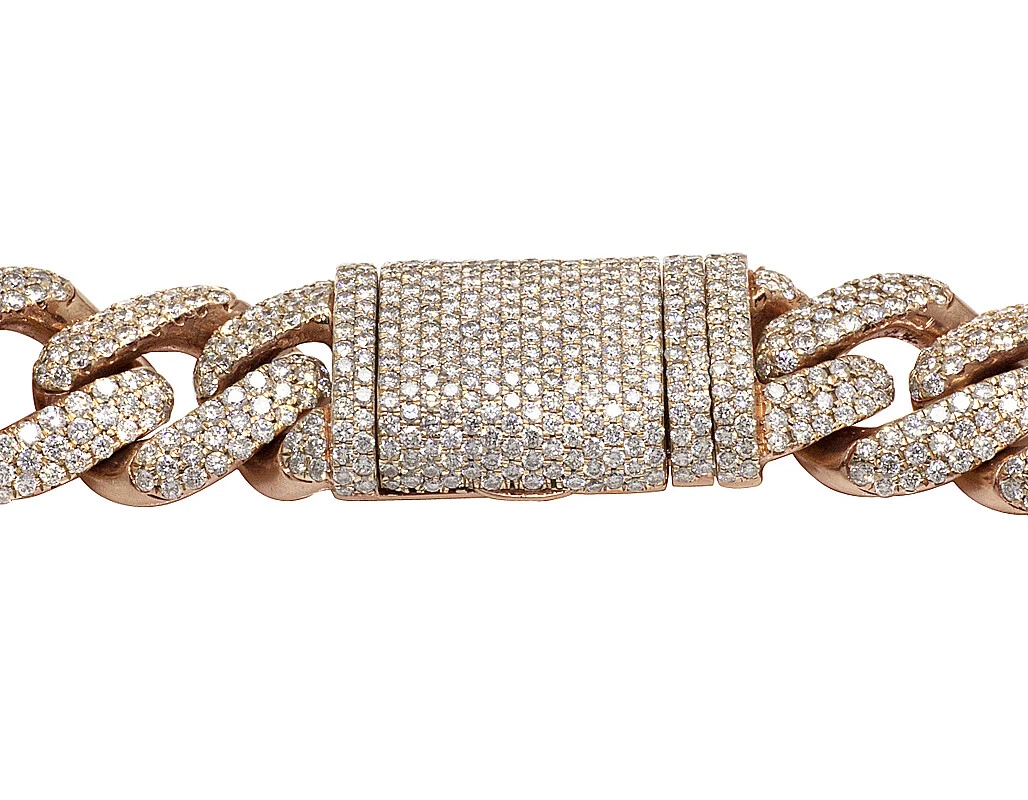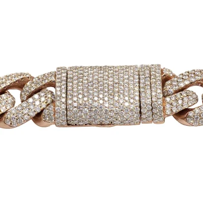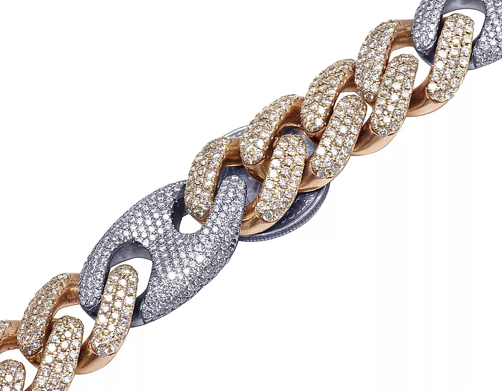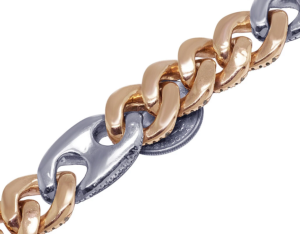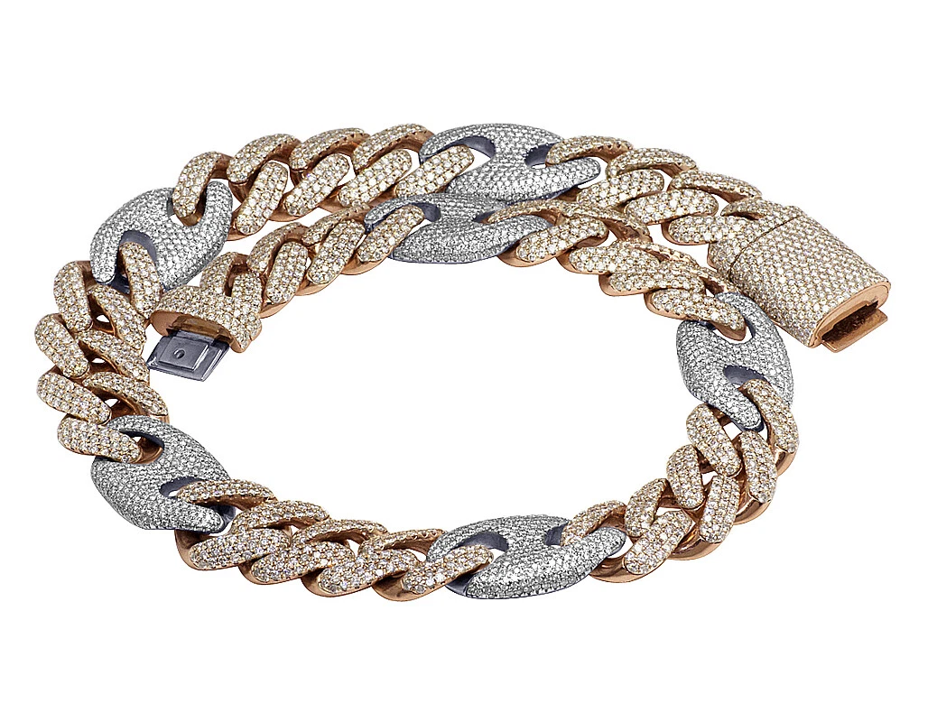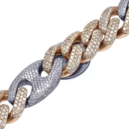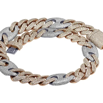 This exquisite diamond Cuban Mariner chain is handmade in lustrous 14K Rose and White Gold. Each Rose Gold Cuban and White Gold Mariner link is detailed with pave set brilliant round cut genuine diamonds and which are G-H in color and VS2-SI1 in clarity totaling 59.75 CT. A labor-intensive work where all these diamonds are handpicked and hand-set to eliminate any error and make the chain look flawless. Beautifully crafted in solid gold, this chain weighs 330 grams, measuring 20 mm in width and 20″ in length. With an eye-catching look, this chain is finished in bright polish. Secures with an iced-out box clasp, this bold and masculine chain is for those with sophisticated taste and style.