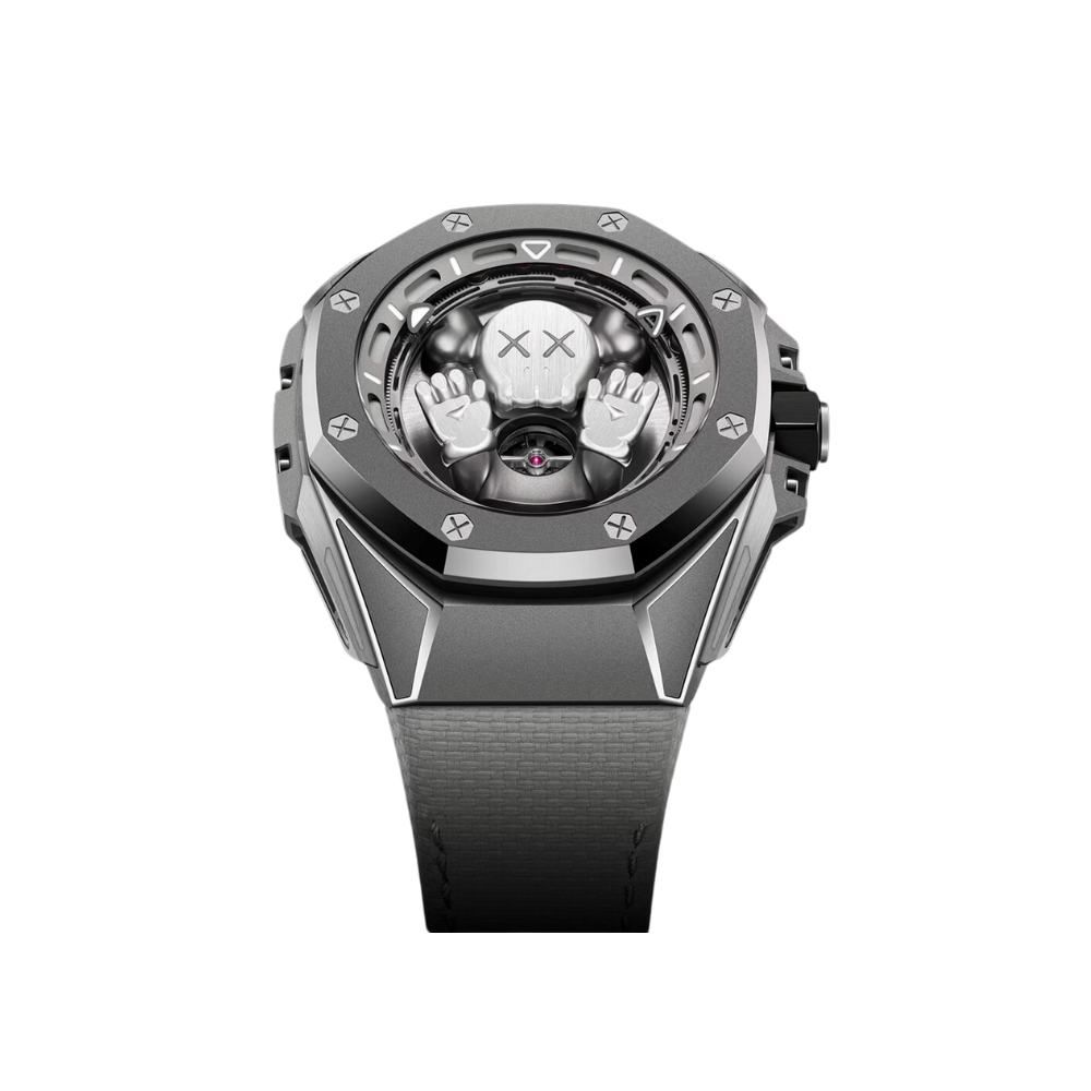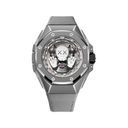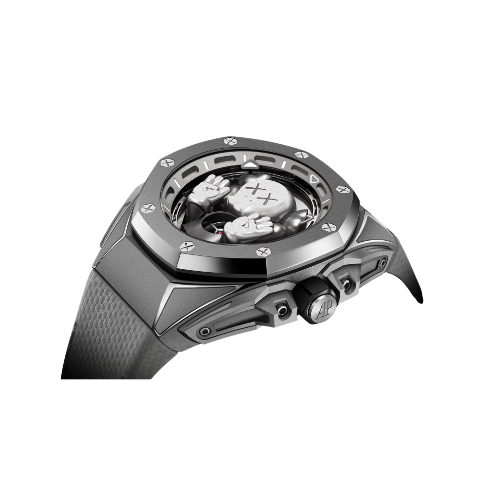 The Audemars Piguet Royal Oak Concept 26656TI.GG.D019VE.01 is a bold and highly exclusive collaboration with contemporary artist KAWS, blending high horology with avant-garde artistry. Limited in production, this model features a light 43mm titanium case. The openworked dial showcases the iconic KAWS “Companion” skull-shaped head, gloves, and of course X-shaped eyes, seamlessly integrated into the movement’s intricate mechanics, making it as much a piece of wearable art as a technical marvel.