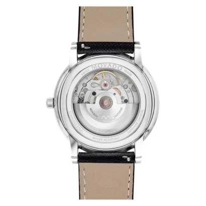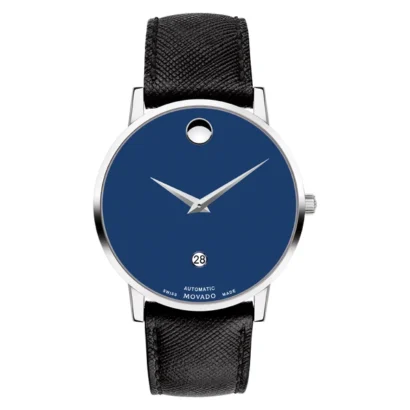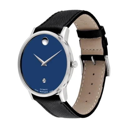 The Movado Museum 0607565 is a sophisticated men’s wristwatch that perfectly balances classic elegance with modern design. Featuring a polished silver stainless steel case with a fixed bezel and exhibition caseback, it houses a striking blue dial with round indexes and the iconic Movado logo pattern. Powered by a precise Swiss automatic movement with 26 jewels, this timepiece offers a 12-hour dial, date indicator, push/pull crown, and sapphire crystal for durability and scratch resistance. The 40 mm case is paired with a black leather two-piece strap, offering comfort and style. Water-resistant up to 30 m (3 ATM) and complete with original packaging, manual, and warranty, the Movado Museum is an ideal choice for formal and everyday wear.