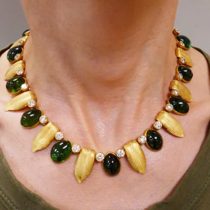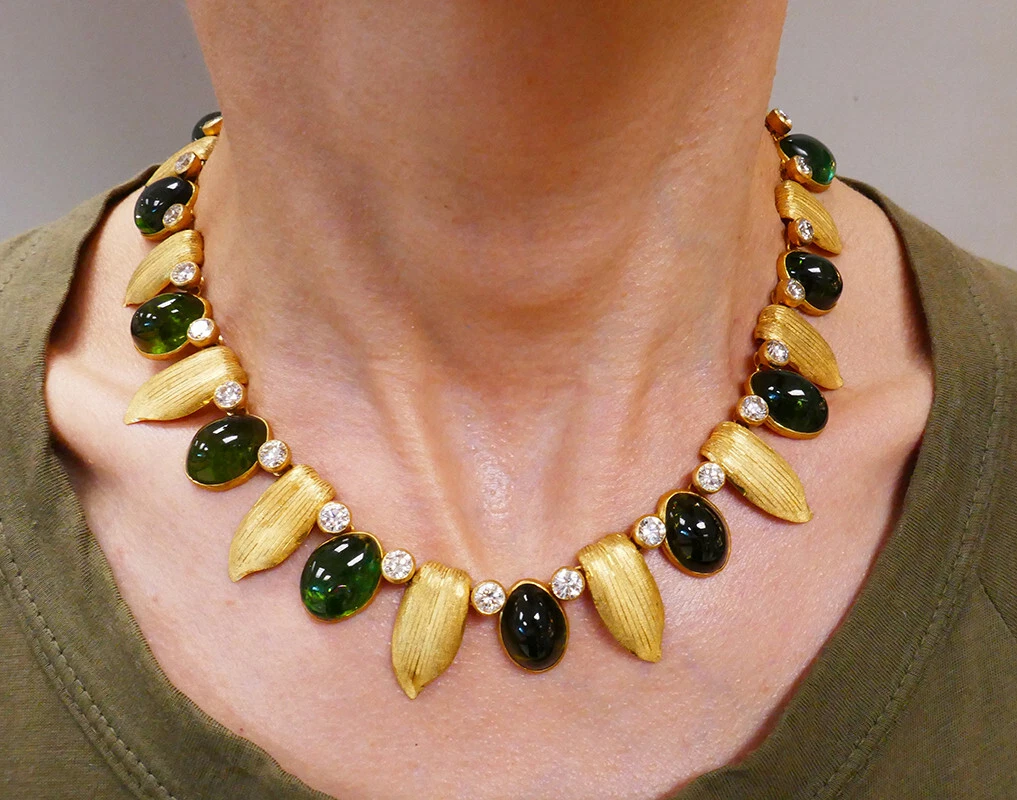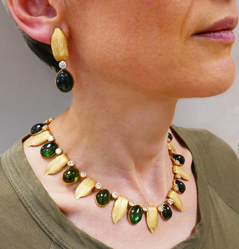These vintage Buccellati necklace and earrings are made of 18 karat yellow gold and feature approximately 120 carats of oval cabochon green tourmaline and 15.48 carats of round brilliant cut diamonds (G-H color, VS clarity).