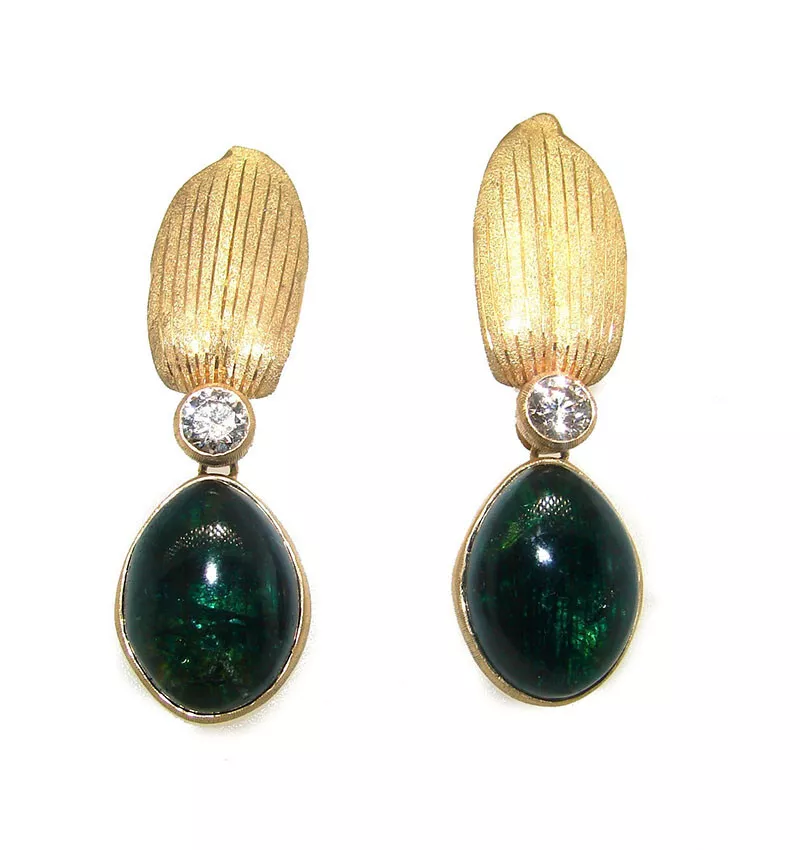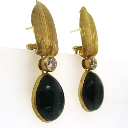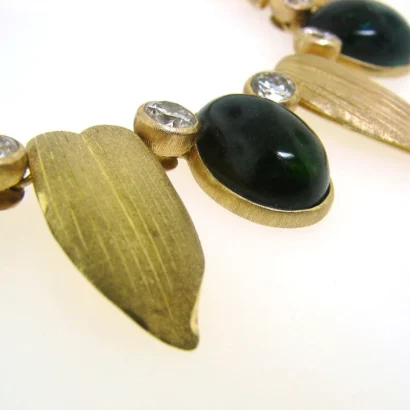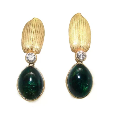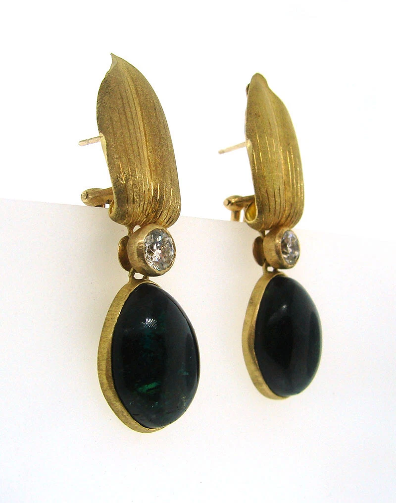 The necklace measures 16 ½” x 7/8” (42 x 2.4 cm), the earrings 1 ¾” x ½” (4.5 x 1.2 cm). The green tourmaline cabochons measure 5/8” x ½” (1.7 x 1.3 cm).