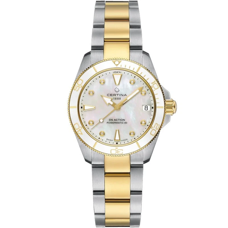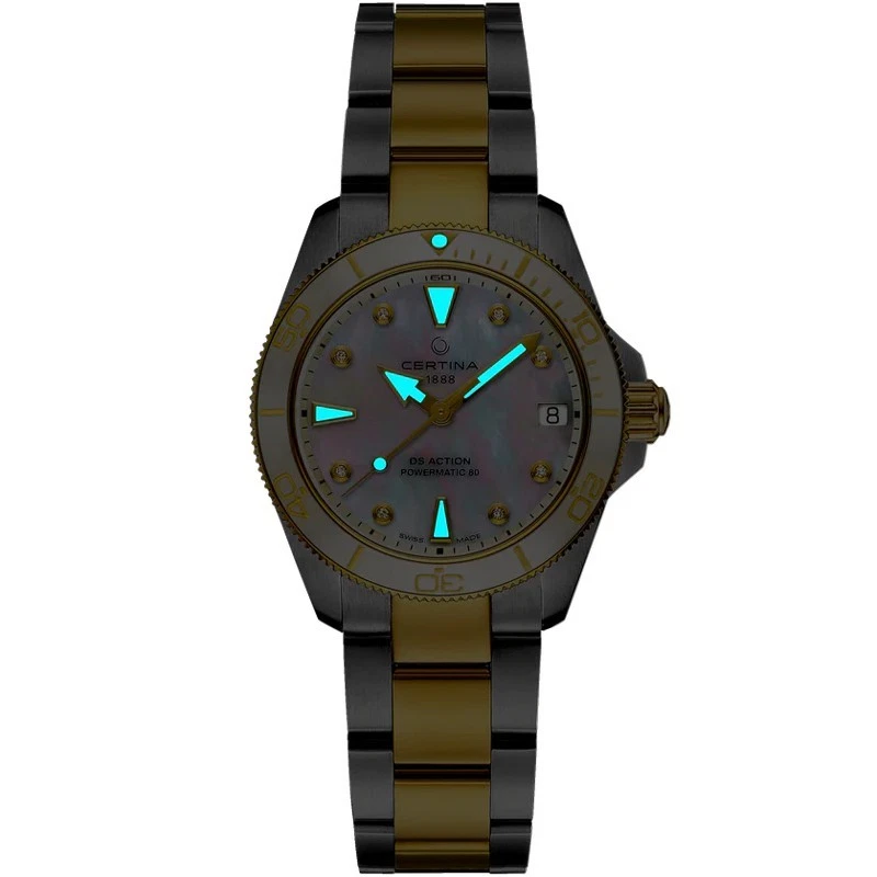 The Certina DS Action 34.5mm Powermatic 80 is a masterclass in blending robust dive watch engineering with refined feminine elegance, featuring a stunning mother-of-pearl dial that shimmers with iridescent light beneath its scratch-resistant sapphire crystal. Housed in a sleek 316L stainless steel case with a durable PVD coating and a solid caseback, this timepiece boasts an impressive 300 meters of water resistance, secured by a screw-down crown and the brand’s iconic Double Security (DS) concept, making it as reliable in the depths as it is beautiful at the surface. Powered by the efficient Swiss automatic Powermatic 80 movement, it offers an 80-hour power reserve, while Super-LumiNova on the hands and baton indexes ensures perfect legibility in any light. The integrated silver stainless steel bracelet completes a versatile profile that effortlessly transitions from casual and sporty underwater adventures to classic and luxurious everyday wear, delivered as a complete set with box, papers, and booklet straight from Switzerland.