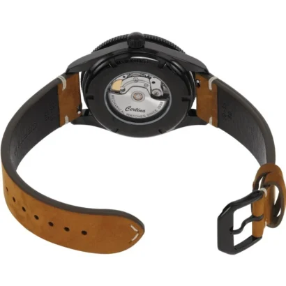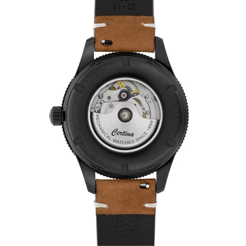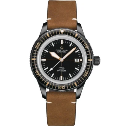 The Certina DS PH200M is a modern re-edition of a 1960s diving icon, masterfully updated with contemporary materials and Swiss precision while retaining its vintage tool-watch charm and robust functionality. Its 42.8mm stainless steel case features a durable black PVD coating and is equipped with a unidirectional rotating bezel with a scratch-resistant black ceramic insert, ensuring precise timing for dives. The highly legible black dial, adorned with luminous round indexes and hands, is protected by a domed sapphire crystal and powered by a reliable self-winding automatic movement visible through the exhibition case back, all secured by Certina’s Double Security (DS) concept for enhanced water resistance up to 200 meters. Paired with a vintage-style brown leather strap featuring a black PVD pin buckle, this timepiece is a perfect blend of nostalgic design, modern durability, and professional diving capability.