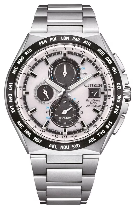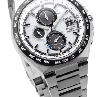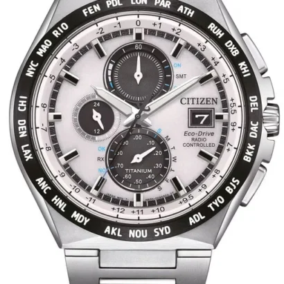The Citizen Radio Controlled Super Titanium AT8238-84A is a pinnacle of high-tech horology, combining advanced atomic timekeeping with exceptional durability and lightweight comfort in a sophisticated and feature-rich package. Crafted from Citizen’s proprietary Super Titanium, which is five times harder and more scratch-resistant than stainless steel yet 40% lighter, its 44mm case houses a complex white dial with a chronograph, world time, perpetual calendar, and power reserve indicator, all protected by a pristine white sapphire crystal. The watch is powered by Eco-Drive technology, which charges in any light, and synchronizes daily via radio-controlled atomic signals for unparalleled accuracy anywhere in its coverage zone, ensuring the correct time, date, and daylight saving adjustments are always maintained. With 100 meters of water resistance, luminous hands and indexes, and a comfortable titanium bracelet with a fold-over deployant clasp, this timepiece is the ultimate fusion of intelligent functionality, rugged luxury, and maintenance-free convenience.