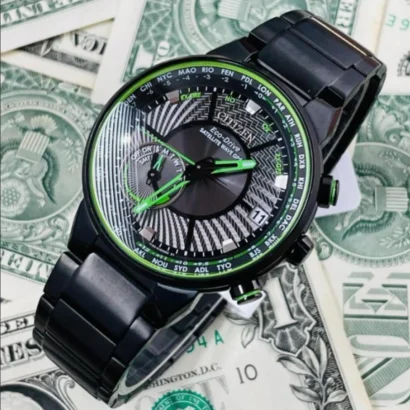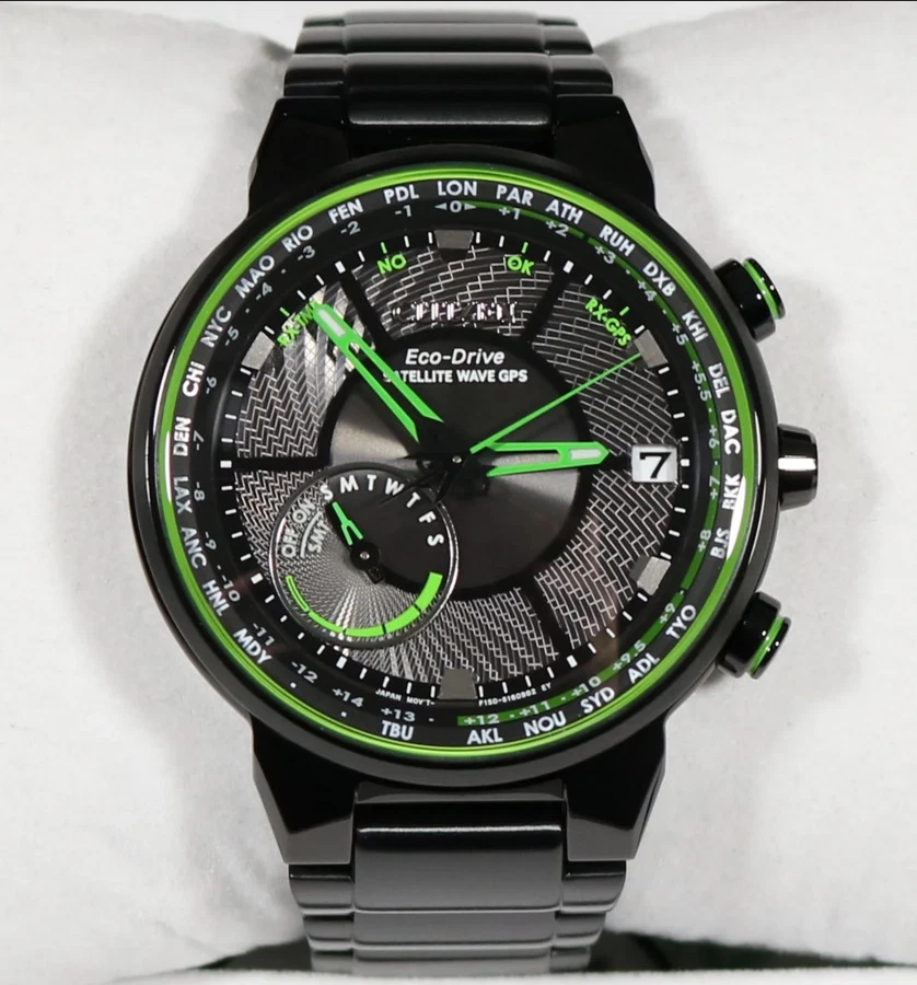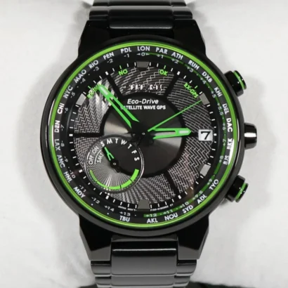 The Citizen Satellite Wave Freedom CC3035-50E Eco-Drive Black Dial Men’s Watch combines advanced technology with sophisticated design. Powered by Citizen’s Eco-Drive Movement, this watch harnesses light to power the watch, eliminating the need for battery changes. The 44mm round stainless steel case features a black ion plating finish, giving it a sleek, modern look. The black and green dial includes luminous hands for clear readability in low light, and the perpetual calendar and world time features make it a versatile choice for frequent travelers. With 100m (10 ATM) water resistance, this watch is suitable for swimming and snorkeling. The bracelet band ensures a secure and comfortable fit, and the deployant closure adds convenience. This watch also features a date indicator, power reserve indicator, and mineral crystal for added durability. The original box, papers, and 2-year manufacturer warranty come with this timepiece, ensuring a high-quality experience.