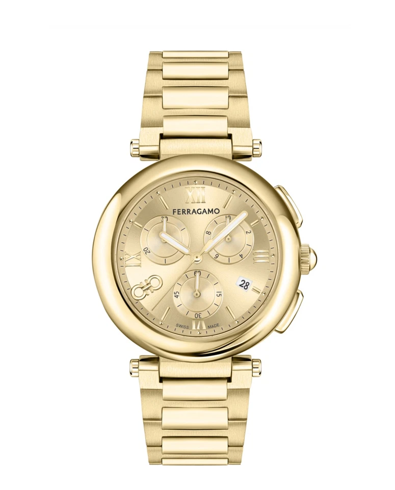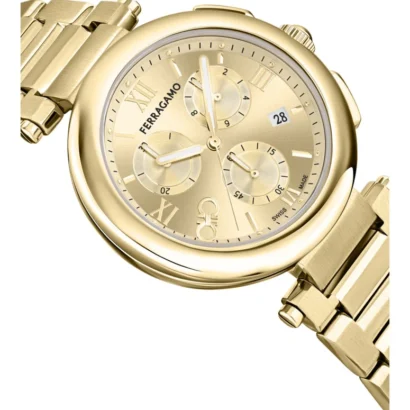 The Ferragamo Women’s Gold 40mm Bracelet Fashion Watch (Ref. SFU200623-GOLD1-OS) is an exquisite Swiss-made timepiece that exudes elegance and luxury. Featuring a gold stainless steel case and bracelet, this watch offers a stunning visual appeal with its gold dial, adorned with Roman numerals for a classic look. Powered by a Swiss-made chronograph date quartz movement, this watch ensures precise timekeeping. The 50m (5 ATM) water resistance makes it suitable for light water exposure, while the deployant closure provides security and comfort. This watch is perfect for both casual and formal occasions, making it a versatile addition to any collection. Delivered with original box, papers, and a 2-year manufacturer warranty, it offers both style and reliability.