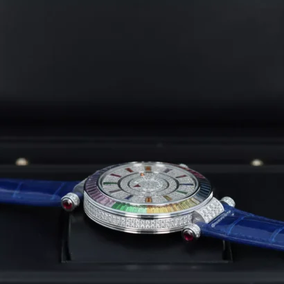 Franck Muller Double Mystery Quatre Saisons Baguette Diamond Boutique Novelty Rainbow Edition in 18kt White Gold “Master of Complications” 42mm Four Seasons, Hand-Set Baguette Sapphire & Ruby & Tsavorites Bezel and Pave Round Brilliant Diamond Case, Pave Diamond Dial with Multicolor Baguette Hour Markers, Round Ruby Cabochons, Self-Winding Automatic Movement, Skeleton Back. Fitted on a Hand-Sewn Alligator Strap with 18kt White Gold Pave Diamond Buckle.