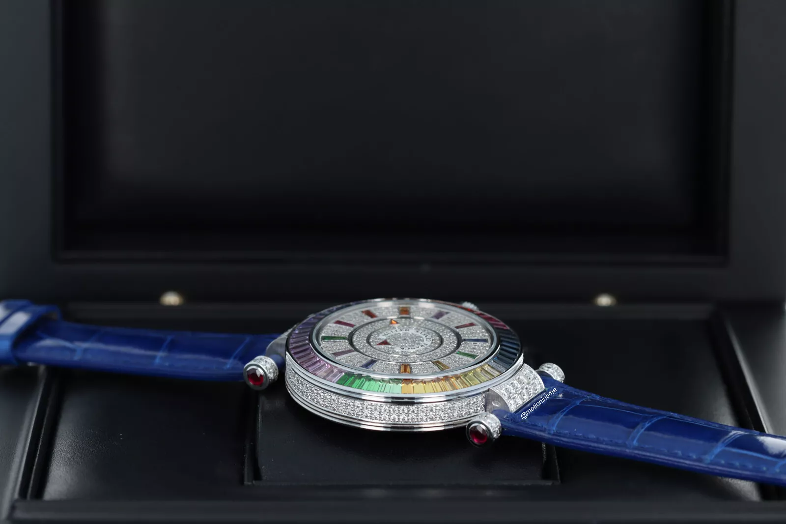 The craftsmanship on this watch is absolutely stunning. It is hand-set with 60 baguette-cut sapphires, rubies and tsavorites (5.92 carats) and 172 brilliant-cut diamonds (2.55 carats). The dial is hand set with 218 brilliant-cut diamonds (1.37 carats) and 14 indexes made of colored sapphires, rubies and tsavorites (0.98 carats). The buckle is hand set with 8 brilliant-cut diamonds