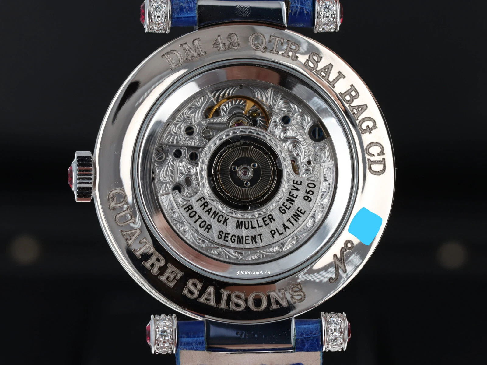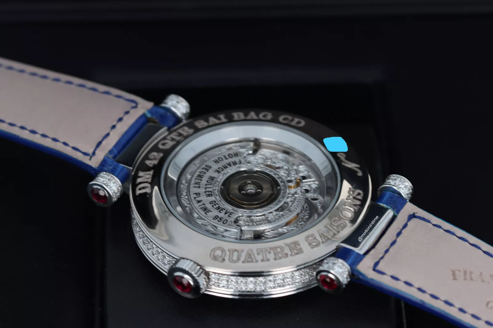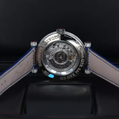 Franck Muller Double Mystery Four Seasons Baguette Diamond Boutique Novelty Edition has a mechanical automatic self-winding caliber MVD FM 2800 movement. It’s rhodium plated with cotes de Geneve embellishment, and it’s constructed with 217 Components and 21 jewels, a self-winding movement with bidirectional rotor system, and a shock absorber system. The mechanism oscillates at a frequency of 28,800 vph (4 Hz). It features Côtes de Genève and brushing “soleil papier” on the bridges and the rotor as well as circular graining on the two sides of the main plate and chamfering of the bridges. It has 24k Gold bath and rhodium plating of the components and 24k Gold finish on the written engravings. There are circular brushing of the rotor ball bearing, brushing “soleil papier” on the barrel, polishing at 45° and brushing “soleil” of the ratchet and polished and blued screws.