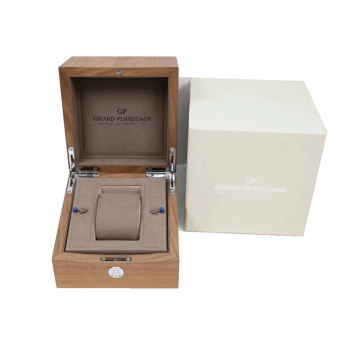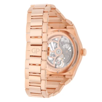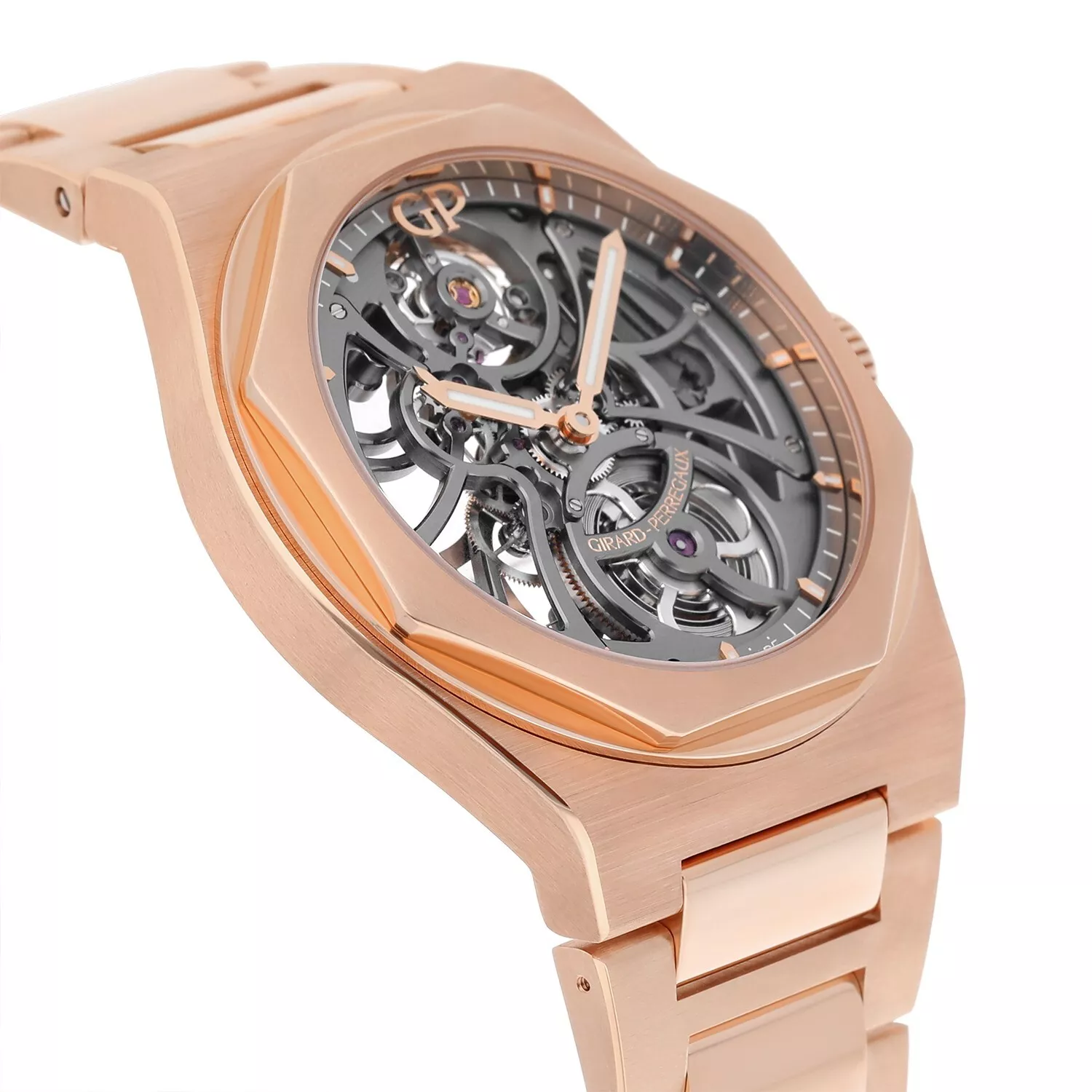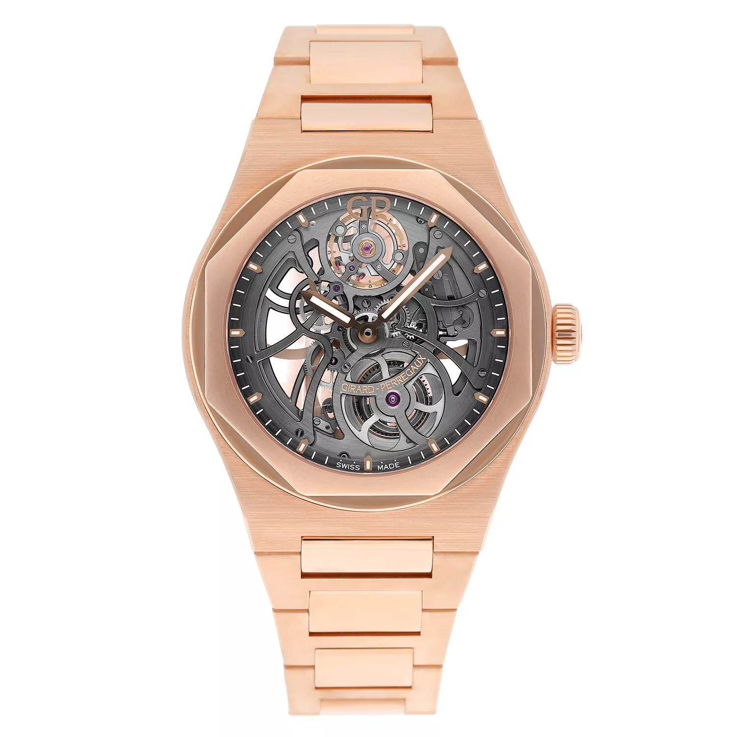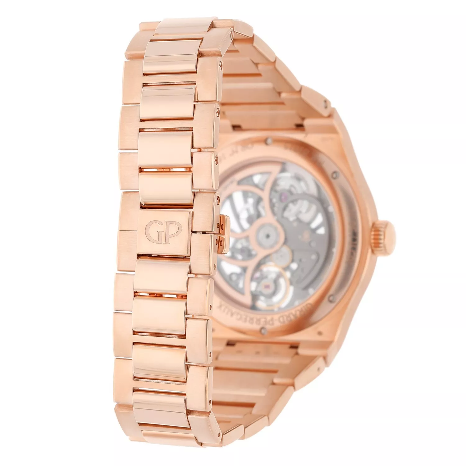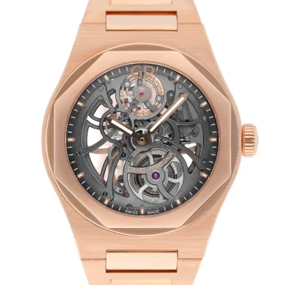Skeleton watches represent great art in miniature: Since the intrinsically filigree movement parts are broken down to their supporting basic substance, they allow fascinating insights into their micromechanical cosmos. The Laureato Skeleton Ref. 81015-52-002-52A, whose manufacture caliber GP01800-0006 is free of all redundant material, also possesses exquisite charm down to the most minute detail. For example, the four-heart oscillating balance of the automatic caliber, which has a power reserve of 54 hours, appears at 12 o’clock. This masterpiece is housed in a 42 millimeter, 10.88 millimeter high 18k rose gold case that is water-resistant to ten bar.