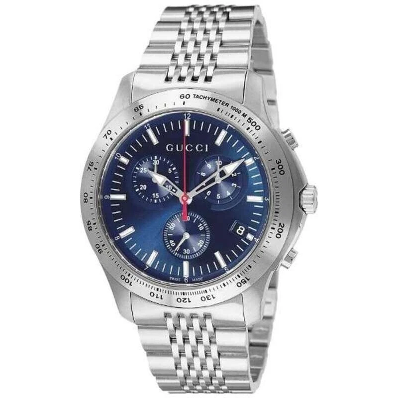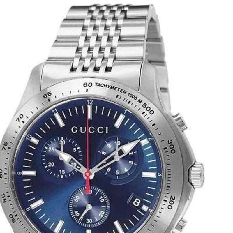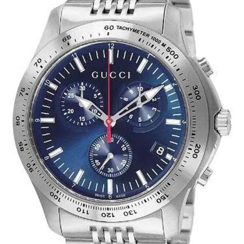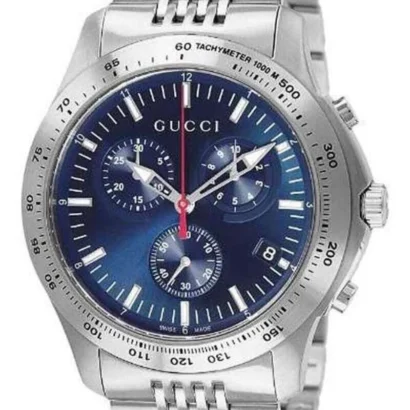 The Gucci G-Timeless YA126256 is a sophisticated men’s wristwatch that perfectly combines classic elegance with modern functionality. Featuring a 45 mm polished stainless steel case with a silver fixed bezel and a matching stainless steel bracelet, this timepiece radiates luxury. Its blue dial with baton indexes offers a clear and stylish display, while the quartz movement ensures precise timekeeping. Equipped with chronograph functions, date indicator, luminous hands and markers, sapphire crystal, and self-winding Swiss movement, this watch is both practical and luxurious. Water-resistant up to 50 m (5 ATM), it is suitable for everyday wear and formal occasions. Delivered with its original box and manual, the Gucci G-Timeless is a testament to Swiss craftsmanship and refined design.