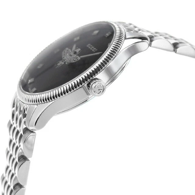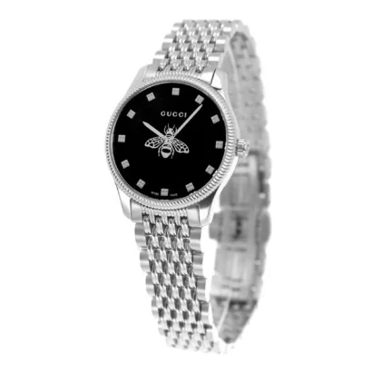 The Gucci G-Timeless YA1265020 Black Quartz Women’s Watch is a sleek, modern piece that brings together understated luxury and everyday practicality. Its 29 mm polished stainless steel case and slim 7 mm profile sit elegantly on the wrist, while the classic black dial with baton indexes keeps the design clean, minimal, and easy to read. Powered by a precise quartz movement using materials sourced from Switzerland, it offers reliable, low-maintenance timekeeping behind its refined analog display. The stainless steel bracelet in silver with a fold-over push-button deployant clasp ensures a secure and comfortable fit, perfect for both daily wear and more dressed-up occasions. With 50 m (5 ATM) water resistance, a screwback case, and a fixed silver bezel, this G-Timeless balances style and durability. Delivered new in box with original packaging, manual/booklet, and papers, it’s an ideal choice for women seeking a versatile, elegant Gucci timepiece that complements casual looks while still feeling distinctly premium.