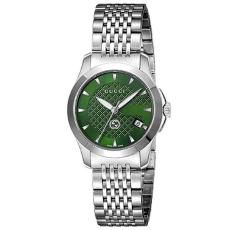 Elevate your style with the Gucci G-Timeless Women’s Watch, a perfect blend of classic elegance and modern craftsmanship. Featuring a polished silver stainless steel case and bracelet, this timepiece showcases a striking green dial with baton indexes for easy readability. The 27mm round case, 7mm thickness, and 10mm lug width offer a comfortable fit for daily wear. Powered by precise Swiss quartz movement, it includes a 12-hour dial, date indicator, and water resistance up to 30 meters. Designed with a fold-over push-button deployant closure and screwback case, this watch combines durability with timeless sophistication. Ideal for casual, classic, or formal occasions, it comes complete with original packaging and a user manual, making it a perfect gift or personal indulgence.