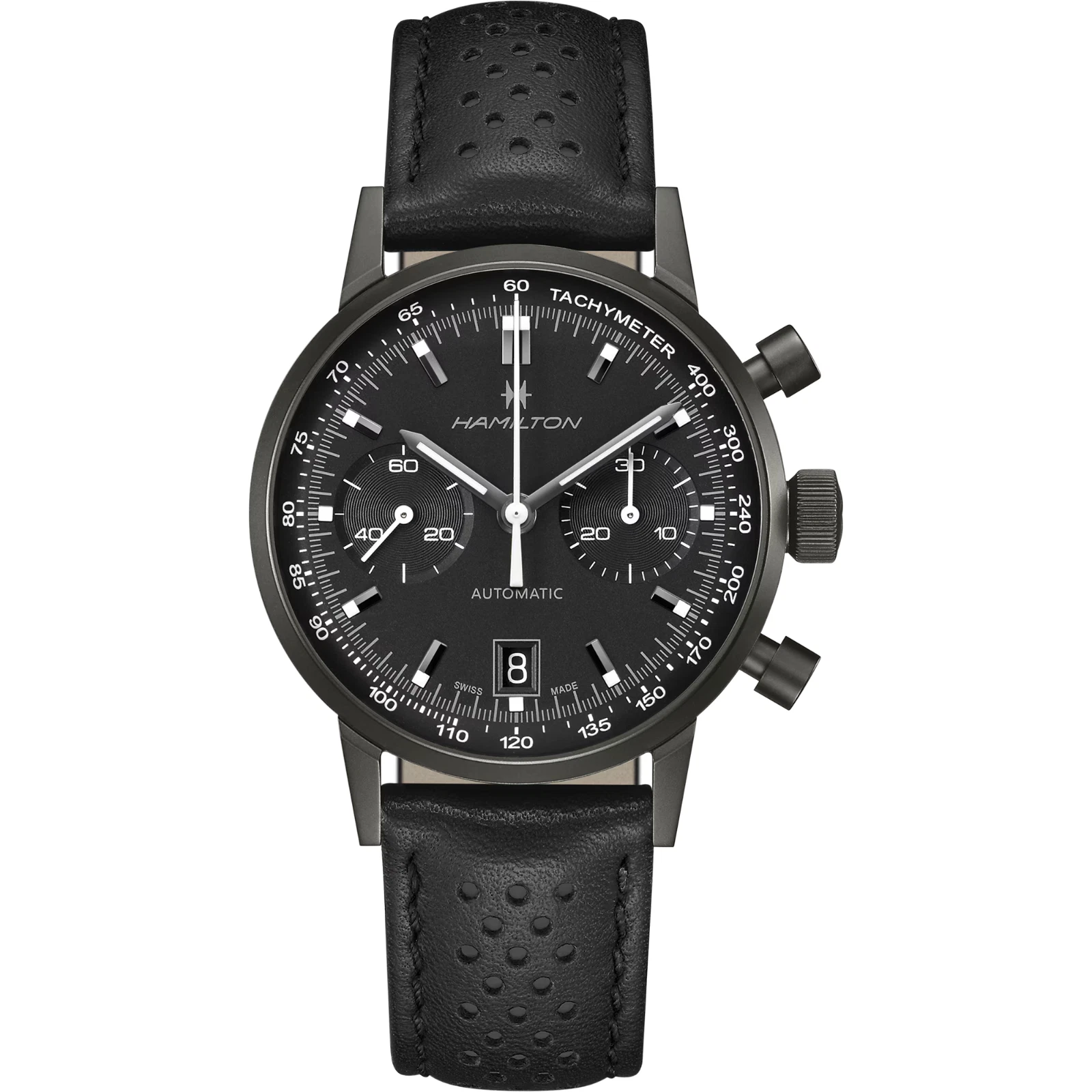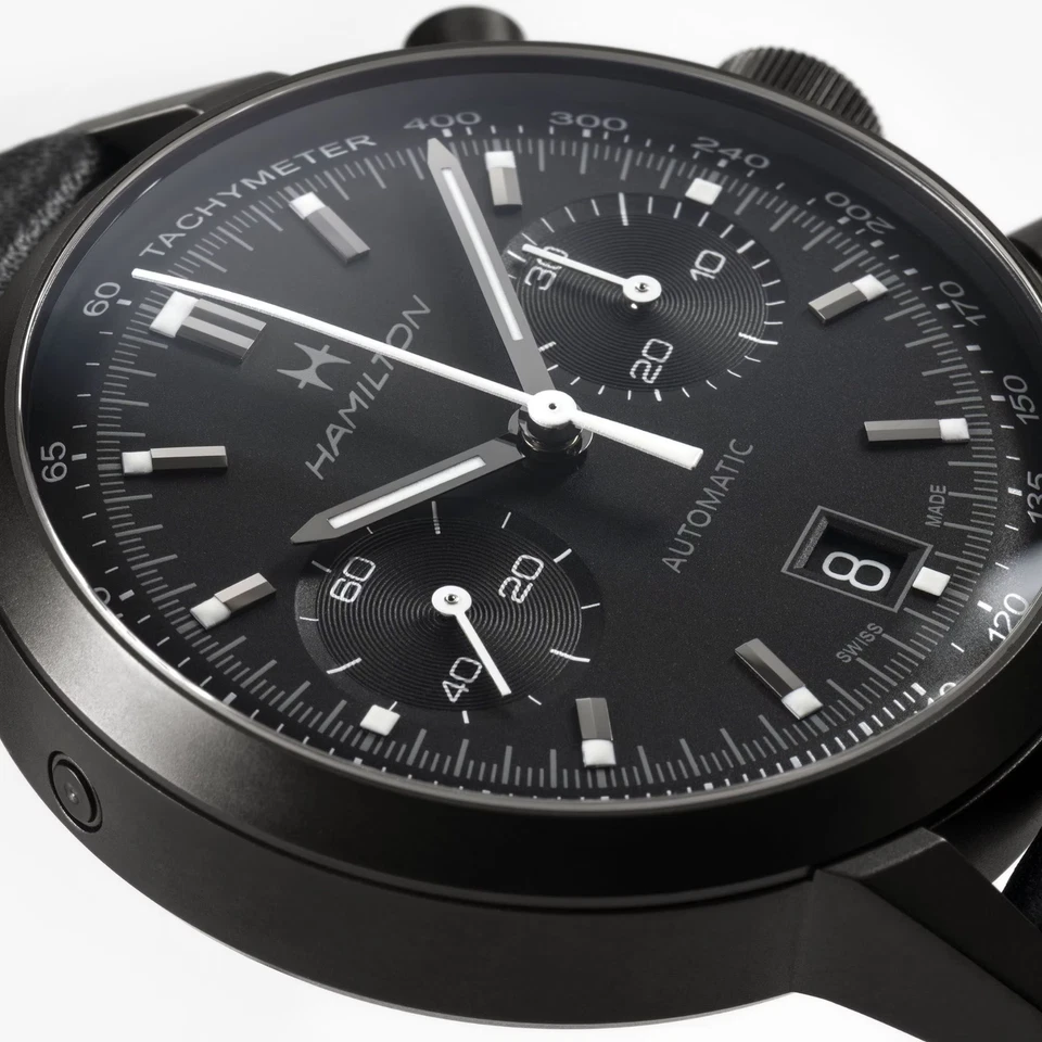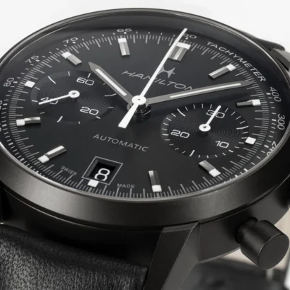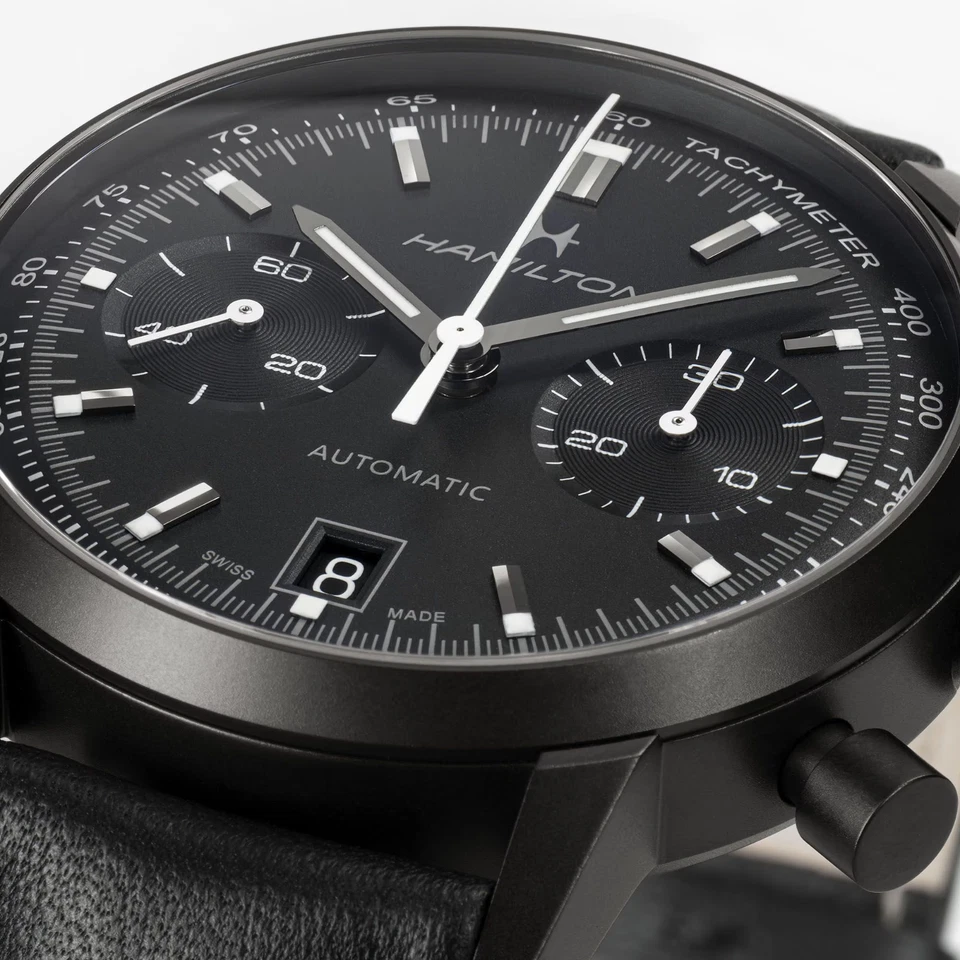 The Hamilton American Classic Intra-Matic Auto Chrono H38446730 is a stylish blend of vintage racing spirit and modern Swiss watchmaking, designed for men who want a chronograph that works as well with a suit as it does with a leather jacket. Its 40 mm polished stainless steel case with a stealthy black dial hosts multiple chronograph sub-dials, a date display, and a tachymeter scale, giving it true tool-watch credentials while maintaining a clean, classic layout with non-numeric markers. Powered by a Swiss automatic movement with an impressive 60-hour power reserve, it delivers reliable performance you can depend on all weekend. The sapphire crystal and 100 m (10 ATM) water resistance add durability, while luminous hands and markers ensure legibility in low light. A black leather two-piece strap with buckle completes the look, and the see-through caseback reveals the movement inside. Supplied with original box, papers and manual and backed by a 2-year manufacturer warranty, this Intra-Matic Auto Chrono is a versatile choice for anyone who appreciates classic chronograph design with modern specs.