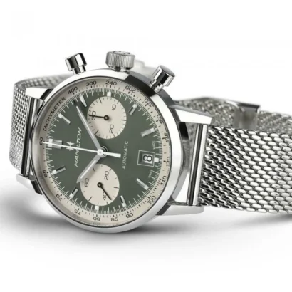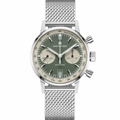 The Hamilton H38416160 men’s wristwatch is a sophisticated and versatile timepiece designed for classic, dress/formal, luxury, and sport occasions. Featuring mechanical automatic movement with a 60-hour power reserve, it offers precision and reliability. The green analog dial with 24-hour and multi-dials, multiple hands, and luminous markers is paired with a polished silver stainless steel case and Milanese mesh bracelet with fold-over push-button deployant closure.