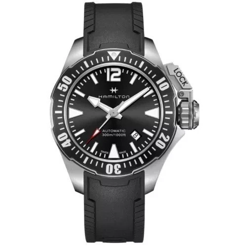 The Hamilton Khaki Navy H77605335 is a premium men’s diver watch combining rugged functionality with refined Swiss craftsmanship. It features a polished black stainless steel case with a fixed black bezel, paired with a durable black rubber strap for secure, comfortable wear. The black dial, accented with Arabic numerals and baton indexes, includes luminous hands and indexes, a date display, and a rotating bezel for precise timing. Powered by a reliable automatic Swiss movement, this timepiece offers water resistance up to 300 m (30 ATM) and scratch-resistant sapphire crystal, making it perfect for both underwater adventures and formal occasions. Complete with original packaging, manual, and booklet, the Khaki Navy is a versatile luxury watch for men who value performance and style.