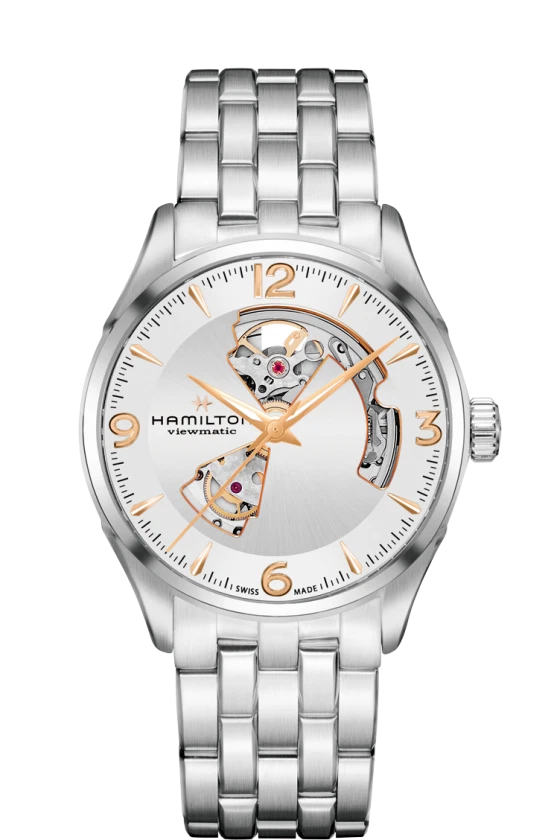The Hamilton Jazzmaster Open Heart Auto (Ref. H32705151) is a refined Swiss luxury timepiece that reveals just enough of its mechanical heart to stand out while remaining elegantly understated. Its 42 mm stainless steel case with a matte silver finish frames a matching silver open-heart dial, where carefully placed cut-outs offer a view of the automatic movement working within, enhanced by luminous hands and clean non-numeric hour markers for excellent readability. Powered by a mechanical automatic movement with an impressive 80-hour power reserve, this Jazzmaster is designed to keep running smoothly even if left off the wrist for a few days. The see-through case back further showcases the Swiss craftsmanship, while the solid stainless steel bracelet with fold-over push-button deployant clasp provides a secure and comfortable fit for daily wear. With 50 m (5 ATM) water resistance, sapphire crystal for superior scratch resistance, and a versatile luxury/skeleton style, this watch moves effortlessly between business, formal, and smart-casual settings. Made in Switzerland and delivered in its complete box with certificate of authenticity, papers, manual/booklet, and a 2-year manufacturer warranty, it’s an ideal choice for those who want a sophisticated open-heart design with real mechanical substance.