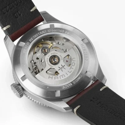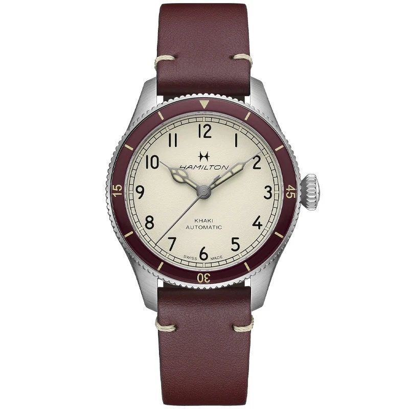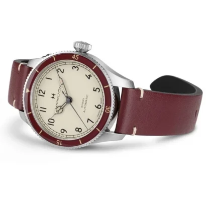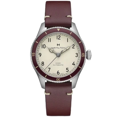 The Hamilton Khaki Aviation Pilot Pioneer reimagines a classic 1970s British military watch with modern Swiss precision, offering a refined and historically inspired timepiece perfect for both aviation enthusiasts and everyday wear. Its 38mm stainless steel case houses a clean, highly legible white dial with bold black Arabic numerals and a distinctive burgundy minutes track, all protected by a scratch-resistant sapphire crystal and powered by a reliable mechanical automatic movement. The watch is secured with a handsome burgundy leather strap that complements the dial’s vintage aesthetic, while its 100-meter water resistance adds a layer of robust practicality. This timepiece masterfully balances nostalgic military design with contemporary craftsmanship, resulting in a versatile watch that excels in both casual and formal settings.
