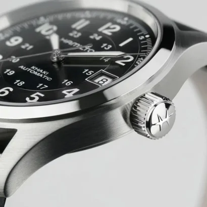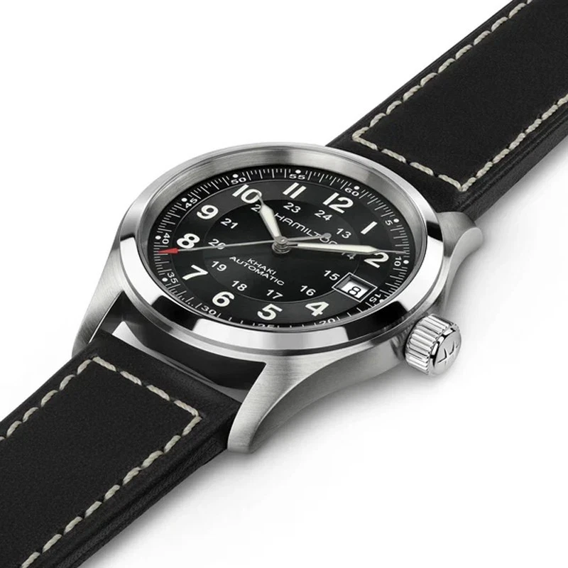 The Hamilton Khaki Field H70455733 men’s wristwatch blends rugged durability with refined style, making it ideal for casual, classic, dress/formal, luxury, and sport occasions. Crafted with a 38 mm stainless steel case in silver, a black leather two-piece strap with pin buckle closure, and a striking black dial with Arabic numeral indexes, this timepiece stands out with sophistication. Featuring mechanical automatic movement, crystal sapphire, chronograph, date function, tachymeter, 11.5 mm case thickness, 100-meter water resistance, and original packaging with manual included, this 2025 model is built for performance and elegance.