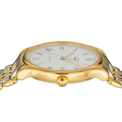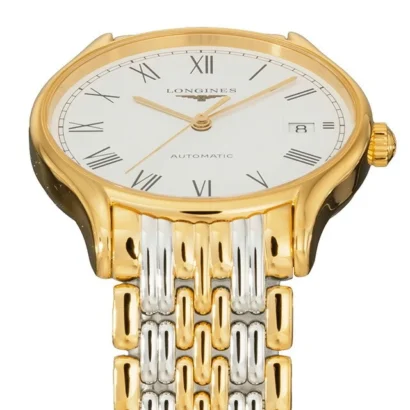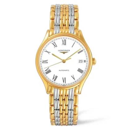 The Longines Lyre L4.860.2.11.7 is an elegant men’s wristwatch that seamlessly combines classic sophistication with everyday functionality. Featuring a polished gold-plated case and bracelet, this 35 mm round timepiece boasts a white dial with Roman numeral indices and a fixed gold bezel for a refined look. Powered by a mechanical automatic movement and protected by a screwback case, it ensures reliable performance for years to come. With a 30 m (3 ATM) water resistance, fold-over push-button deployant clasp, and included original box and papers, the Longines Lyre is perfect for adult men seeking a stylish watch suitable for casual and formal occasions.