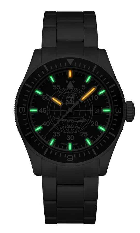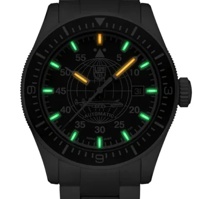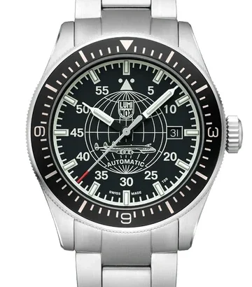The Luminox Air Automatic Constellation XA.9601.M is a robust men’s wristwatch designed for precision and durability, ideal for pilots, military, and sport enthusiasts. Featuring a brushed silver stainless steel case with a unidirectional black rotating bezel and solid caseback, it houses a striking black dial with baton indexes, luminous hands, and large numerals for effortless readability. Powered by a reliable automatic Swiss movement, it includes central seconds, date indicator, and sapphire crystal for scratch resistance. The 42 mm case pairs with a silver stainless steel bracelet, offering both comfort and style. Water-resistant up to 100 m (10 ATM) and delivered with original packaging and manual, this limited-edition timepiece combines functionality, luxury, and Swiss craftsmanship.