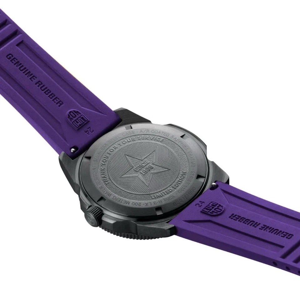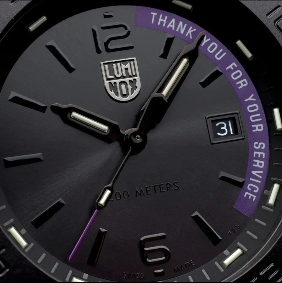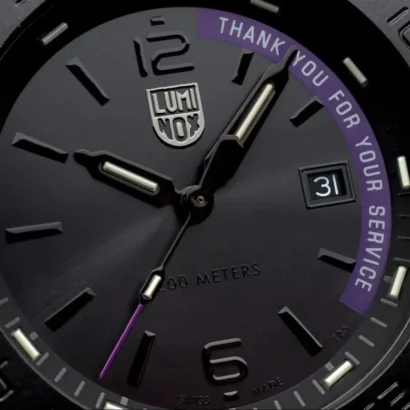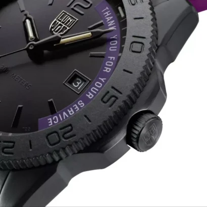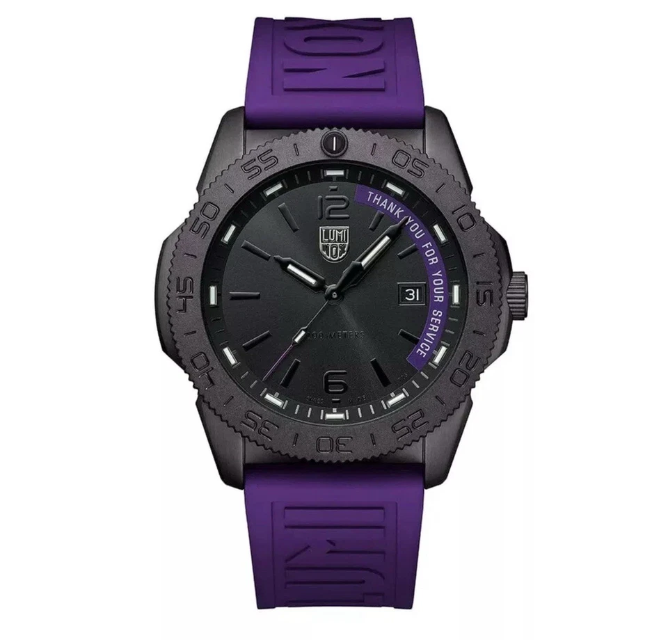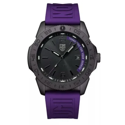 The Luminox XS.3121.BO.TY Pacific Diver is a limited edition dive watch that pays tribute to those who serve with the “Thank You For Your Service” dial. The 44mm round stainless steel case is finished in matte black and houses a scratch-resistant sapphire crystal. The watch features a 12-hour rotating bezel, a date indicator, and Arabic numeral indices for clear readability, designed for both luxury and practical use. With a 200m (20 ATM) water resistance, it’s perfect for diving and everyday activities. Powered by a Swiss quartz movement, this watch is both accurate and durable. The purple and black rubber strap adds a unique touch, making it stand out as both a functional diver’s watch and a fashion statement.