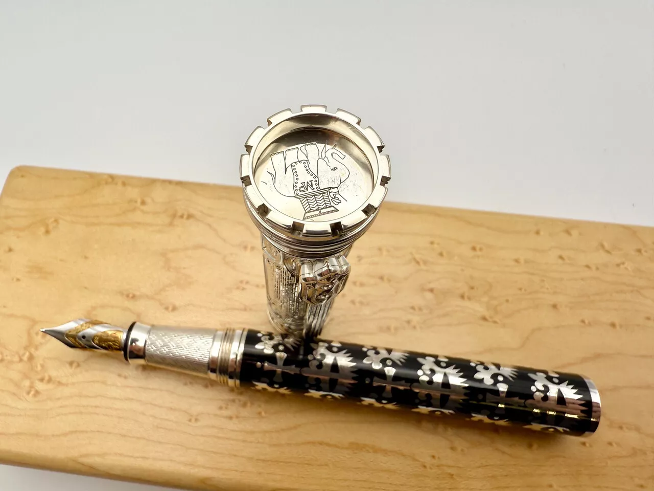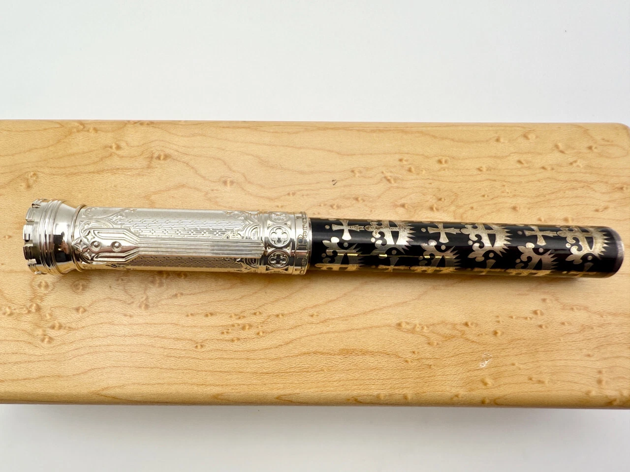 This Stunning Fountain pen has a Medium point 18K gold Nib adorned with beautiful engravings. The pen is presented in brand-new, pristine condition, carefully housed in its original box, making it an ideal gift or addition for those who appreciate the blend of fine materials and artistry. The Michel Perchin Gothic Fountain Pen is not just a writing instrument but a statement piece that combines functionality with artistry, making it perfect for those who desire a unique, high-quality fountain pen with an air of sophistication and rarity.