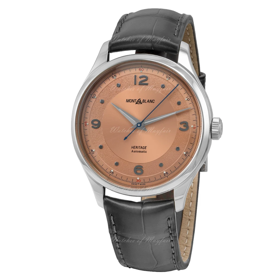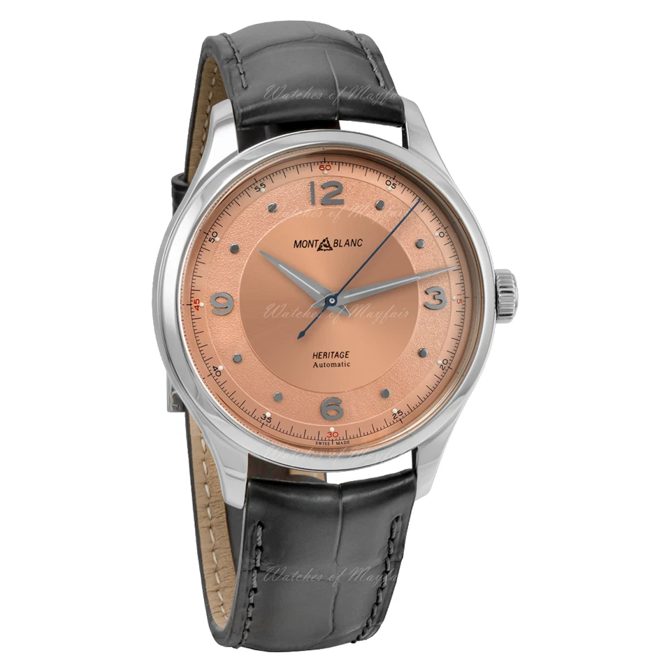 The Montblanc Heritage Automatic reference 119944 is a masterclass in understated elegance, drawing inspiration from mid-century design to create a timepiece of timeless sophistication and refined luxury. Its 40mm stainless steel case, with a polished silver finish, provides a perfect canvas for the exquisite salmon-colored dial, adorned with a combination of Arabic numerals and delicate round indexes that exude vintage charm. Powered by a precise mechanical automatic movement visible through the sapphire case back, this watch offers the artistry of traditional watchmaking alongside modern reliability, complemented by a 50-meter water resistance for daily durability. The supple grey leather strap completes the harmonious and classic aesthetic, making this Heritage model a distinguished choice for the discerning gentleman who appreciates heritage-inspired design and Swiss craftsmanship.