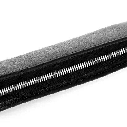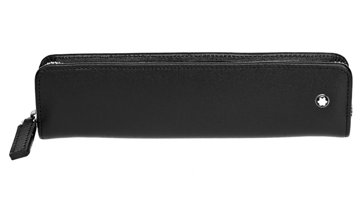 Pouch, made of full-grain calfskin, jacquard lining with Montblanc brand name. Has compartment for 1 writing instrument the size of Meisterstück Classique or Le Grand, Montblanc emblem with palladium finish ring.