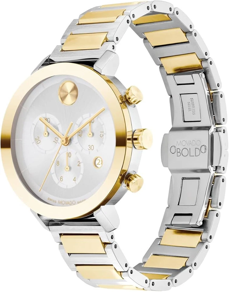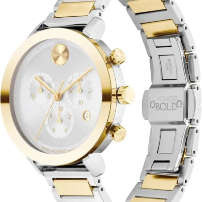 The Movado Women’s Bold Silver Dial Watch (Ref. 3600885) is a timeless piece that combines sophisticated design with the precision of Swiss craftsmanship. Featuring a 38mm round stainless steel case with a sleek gold and silver-tone finish, this watch exudes elegance and versatility. The silver dial, paired with baton hour markers, offers a clean and contemporary aesthetic, while the scratch-resistant mineral crystal ensures durability. Powered by a reliable quartz movement, this timepiece offers accurate timekeeping and is water-resistant up to 30 meters (3 ATM), making it suitable for everyday wear. The stainless steel bracelet, with its multicolor design, adds a stylish contrast and a secure fit with the fold-over push-button deployant clasp. Whether for casual wear or formal occasions, this Movado Bold watch is a perfect accessory for women who appreciate a blend of luxury and function. The watch is delivered in its original Movado box with papers and comes with a 2-year manufacturer warranty.