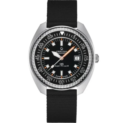 Built for both serious divers and style enthusiasts, the Certina DS SUPER PH1000M men’s wristwatch is a robust fusion of functionality and elegance. Featuring a 43.5 mm black PVD-coated stainless steel case with a rotating black aluminium bezel, this Swiss-made automatic watch delivers exceptional performance with 1000 meters (100 ATM) of water resistance. The black dial is detailed with luminous hands and round indexes for easy readability underwater, protected by scratch-resistant sapphire crystal. A solid caseback and durable two-piece black nylon strap ensure ruggedness and comfort. Equipped with a date indicator, seconds hand, and precision Swiss movement, this watch combines classic dive watch features with luxury craftsmanship.