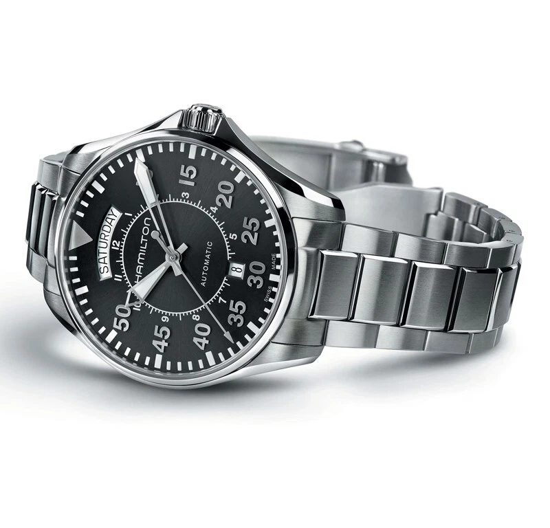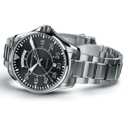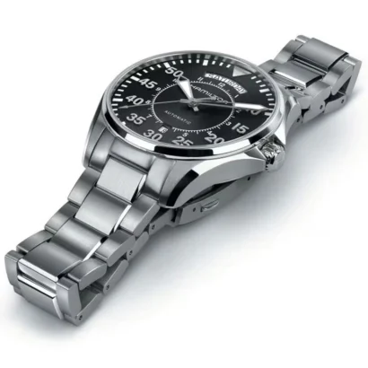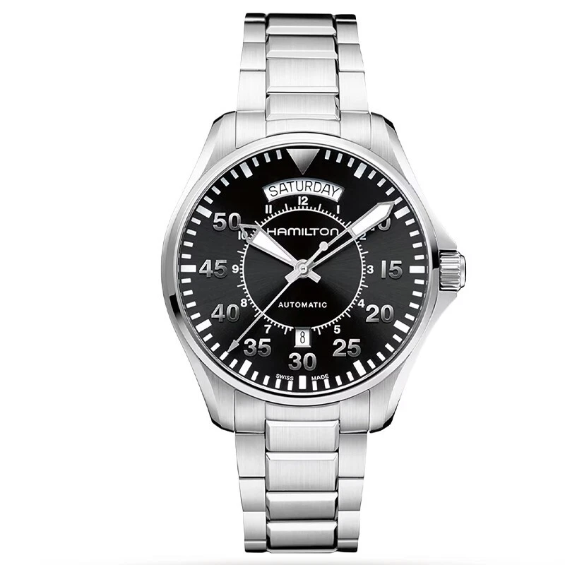 Discover precision and style with the Hamilton Khaki Aviation Men’s Watch, a perfect blend of functionality and elegance. This 42mm round timepiece features a polished silver stainless steel case and bracelet, secured with a convenient butterfly clasp for a seamless fit. The black dial, adorned with Arabic numerals, offers clear readability, while the scratch-resistant sapphire crystal protects against everyday wear. Powered by a reliable mechanical automatic movement, it provides water resistance up to 100 meters (10 ATM), making it suitable for both casual and adventurous occasions. With a fixed silver bezel, 11.85mm case thickness, and 20mm lug width, this watch delivers durability without compromising style. Ideal for casual, classic, or luxury looks, the Hamilton Khaki Aviation comes complete with original packaging, a true statement piece for men who value craftsmanship and sophistication.