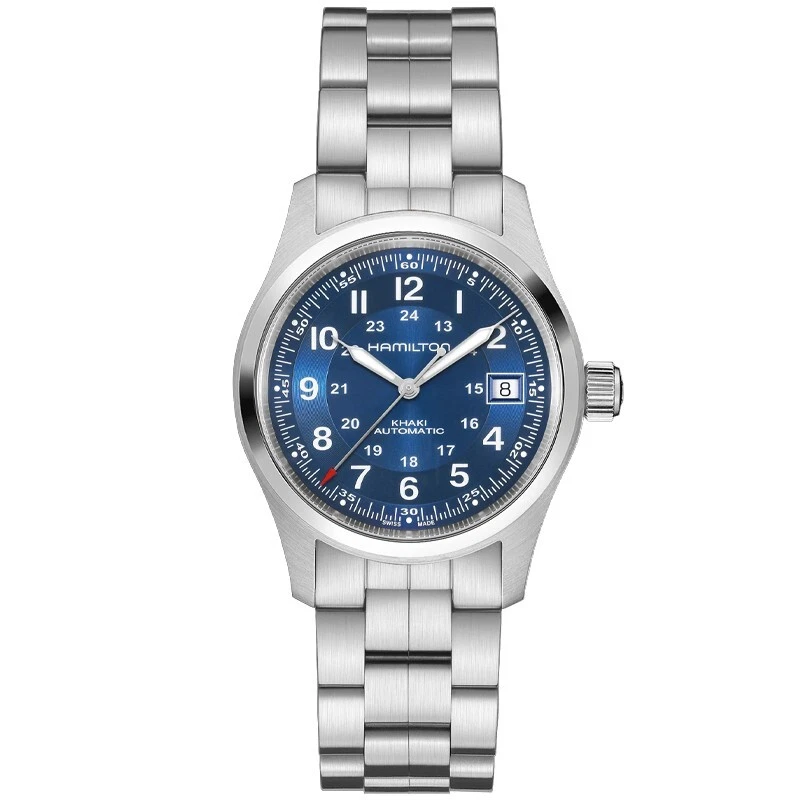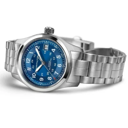 The New Hamilton Khaki Field 38mm Blue Dial Steel Men’s Watch (Ref. H70455140) is a modern take on the classic field watch, combining rugged military heritage with refined Swiss craftsmanship. Its 38 mm stainless steel case and matching silver bracelet create a perfectly balanced profile that wears comfortably on most wrists, while the deep blue dial with bold Arabic numerals offers excellent legibility and a distinctive, versatile look that works with casual, classic, smart and even dress/formal outfits. Powered by a reliable mechanical automatic movement, it keeps time using the natural motion of your wrist, giving you the authentic feel of a true mechanical watch. The fixed silver bezel and clean round case emphasize the Khaki Field’s tool-watch roots, while the sapphire crystal provides superior scratch resistance for everyday wear. With 100 m (10 ATM) water resistance, this Swiss-made piece is well equipped for daily life, light sport, travel and the outdoors. Finished with a secure folding clasp bracelet and delivered with papers, this 2025, non-vintage Khaki Field is an ideal choice for anyone seeking a compact, go-anywhere automatic watch with real heritage and luxury touches.