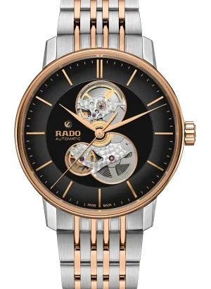 The Rado R22894163 men’s wristwatch is a stunning example of luxury and craftsmanship, featuring a 41 mm stainless steel case with an elegant rose gold and silver matte finish. Its open-heart black dial showcases multiple hands and non-numeric hour marks, powered by a Swiss automatic movement with up to 80 hours power reserve. The transparent sapphire caseback offers a glimpse into the intricate mechanics within, protected by a durable sapphire crystal. Water-resistant up to 50 meters and housed in a complete original box with a certificate of authenticity, this timepiece is a perfect blend of sophistication and reliability, backed by a generous 5-year manufacturer warranty.