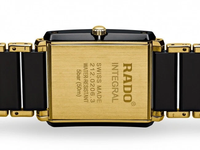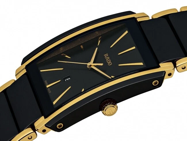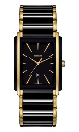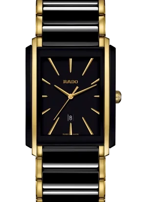 The New Rado Integral High-Tech Ceramic Black Dial Men’s Watch (Ref. R20204162) is a sleek and modern dress piece that showcases Rado’s signature fusion of innovation and luxury. Its distinctive square 31.0 x 41.1 mm case in black and gold combines high-tech ceramic with stainless steel, delivering a refined, scratch-resistant finish that feels as premium as it looks. The minimalist black dial with non-numeric hour markers and slim hands keeps the design clean and elegant, while the discreet date indicator and sapphire crystal add everyday practicality and durability. At just 7.5 mm thick, the watch sits comfortably and unobtrusively on the wrist, slipping easily under a shirt cuff, making it an ideal companion for business, formal events, or sophisticated evening wear. Powered by precise Swiss quartz movement and water-resistant to 50 m (5 ATM), the Integral is as reliable as it is stylish. The matching black and gold high-tech ceramic and stainless steel bracelet completes the integrated look, emphasizing the watch’s streamlined, jewelry-like presence. Manufactured in Switzerland and supplied with complete box, certificate of authenticity, manual/booklet, and a 5-year manufacturer warranty, this Rado Integral is a standout choice for those seeking a slim, luxurious, and unmistakably contemporary timepiece.