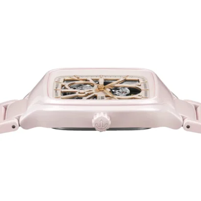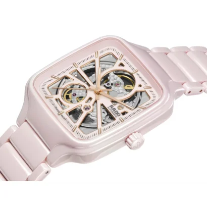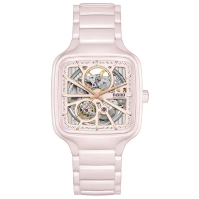 The New Rado True Square Automatic Open Heart Rose Sunray Dial Men’s Watch (Ref. R27123012) is a beautifully crafted luxury timepiece designed for those who appreciate both elegance and precision. The 38mm square high-tech ceramic case in a soft pink finish exudes a modern, yet timeless aesthetic. The rose sunray dial is complemented by diamond accents, adding a touch of sophistication to its design. The exhibition case back allows you to view the intricate Swiss automatic movement at work. Featuring a power reserve of up to 80 hours and sapphire crystal with an anti-reflective coating, this watch ensures durability and readability in various lighting conditions. The 50m (5 ATM) water resistance offers practicality for everyday wear, and the watch is secured by a high-tech ceramic bracelet with a butterfly clasp. This limited edition piece comes with the original box, papers, and a certificate of authenticity, backed by a 5-year manufacturer warranty.