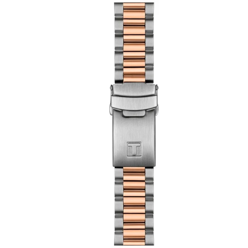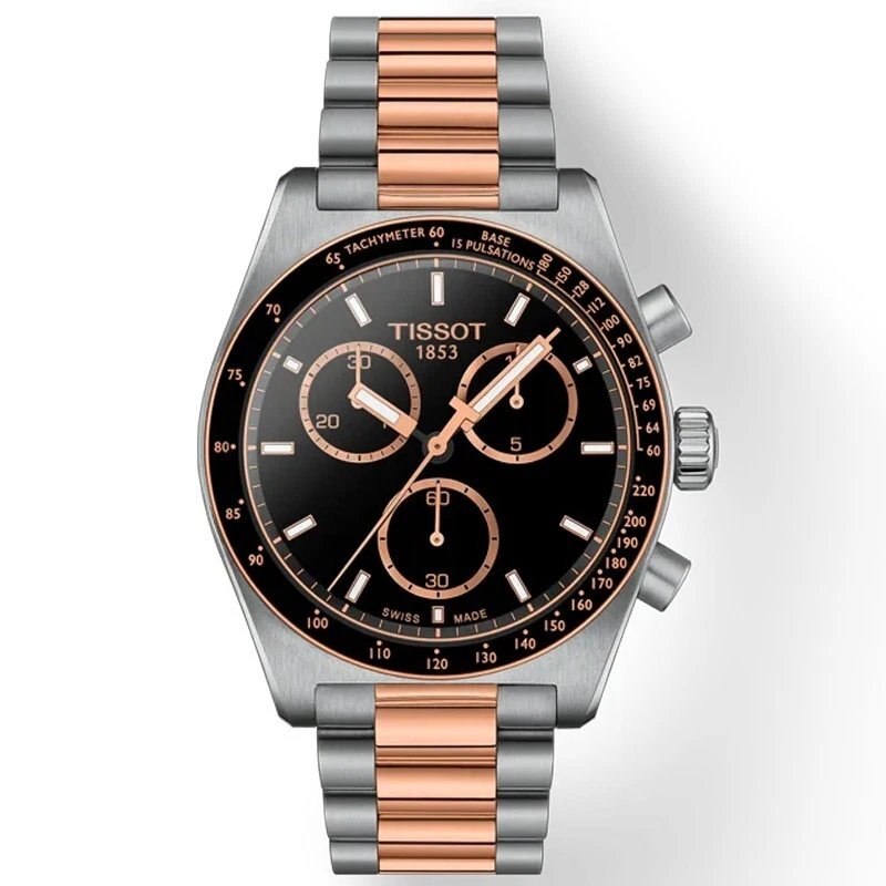 The Tissot PR516 Chronograph revives a celebrated racing heritage with contemporary precision and Swiss elegance, offering a dynamic yet refined timepiece for the modern gentleman. Its 40mm case, crafted from 316L stainless steel, features a distinctive two-tone aesthetic with a rose gold-colored mineral bezel ring, perfectly complementing the black dial with sleek stick indexes and a trio of chronograph sub-dials for measuring elapsed time. Powered by the reliable and innovative Swiss Quartz G10.212 Powerdrive movement, this watch ensures exceptional accuracy while its scratch-resistant sapphire crystal with anti-reflective coating provides outstanding clarity and durability. The integrated bracelet, in a sophisticated silver and rose gold tone, is secured by a folding clasp with safety push-buttons, and with 100 meters of water resistance, the PR516 effortlessly transitions from the racetrack to formal occasions with timeless sporty sophistication.