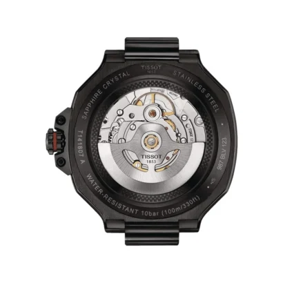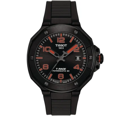 The new Tissot T-Race Powermatic 80 is a dynamic and precision-engineered timepiece that captures the high-octane spirit of motorcycle racing, featuring a robust 41mm case crafted from 316L stainless steel with a sleek black PVD coating and a fixed black bezel for a modern, assertive look. Powered by the advanced Swiss automatic Powermatic 80 movement, visible through the exhibition caseback, it delivers an impressive 80-hour power reserve, while the bold black dial with Arabic numerals is protected by a scratch-resistant sapphire crystal with an anti-reflective coating for superior clarity in any light. Paired with a comfortable black silicone strap and offering 100 meters of water resistance, this watch masterfully blends casual sportiness with refined luxury, making it a versatile companion for both adrenaline-fueled adventures and sophisticated everyday wear.
