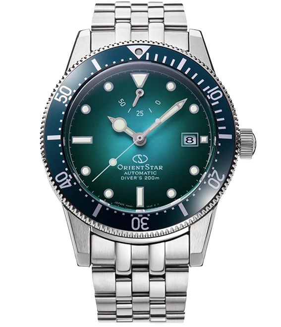 The ORIENT STAR 1964 2nd Edition Diver (Ref. RK-AU0602E) is a meticulously crafted homage to vintage dive watches, blending nostalgic design with modern Japanese precision and robust construction. Its 41mm stainless steel case features a striking green unidirectional rotating bezel that perfectly complements the rich green sunburst dial, adorned with luminous round indexes and a day-date complication for added functionality. Powered by a reliable 22-jewel automatic movement and boasting a substantial 200-meter water resistance with a screw-down crown, this timepiece is built for serious underwater exploration while exuding classic style. The sturdy stainless steel bracelet completes the tool-watch aesthetic, making it a versatile and dependable companion for both diving adventures and everyday casual wear, all delivered with the quality and heritage of the Orient Star collection.