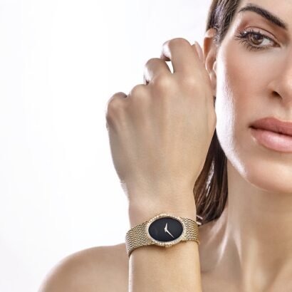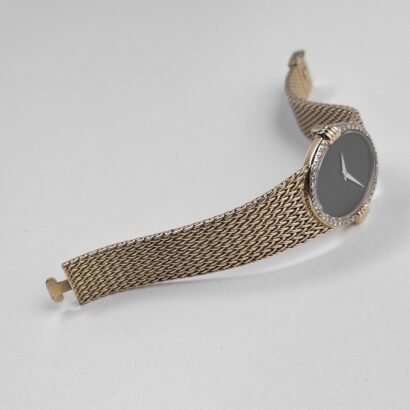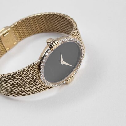 The black onyx dial is a striking centerpiece, providing a deep, lustrous contrast to the brilliance of the diamond-set bezel. Free from unnecessary embellishments, the dial’s minimalist aesthetic ensures an air of timeless sophistication. The gold hands and applied indices subtly complement the case, maintaining perfect harmony in design. The surrounding bezel is meticulously set with brilliant-cut diamonds, adding a radiant frame that enhances the watch’s opulent yet restrained appeal.