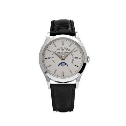 The Patek Philippe Grand Complications 5496P-001 Perpetual Calendar is a timeless masterpiece that exemplifies the brand’s dedication to horological excellence and refined craftsmanship. Crafted in platinum, its 39.5mm case exudes understated elegance, with a polished finish that enhances its sophisticated silhouette. The signature diamond set discreetly between the lugs at 6 o’clock is a hallmark of Patek Philippe’s platinum models, underscoring the exclusivity of this timepiece.