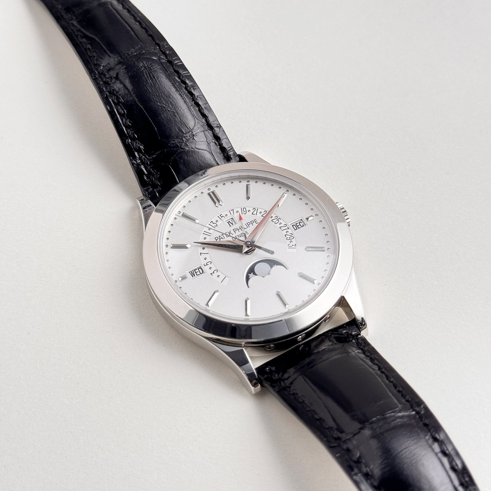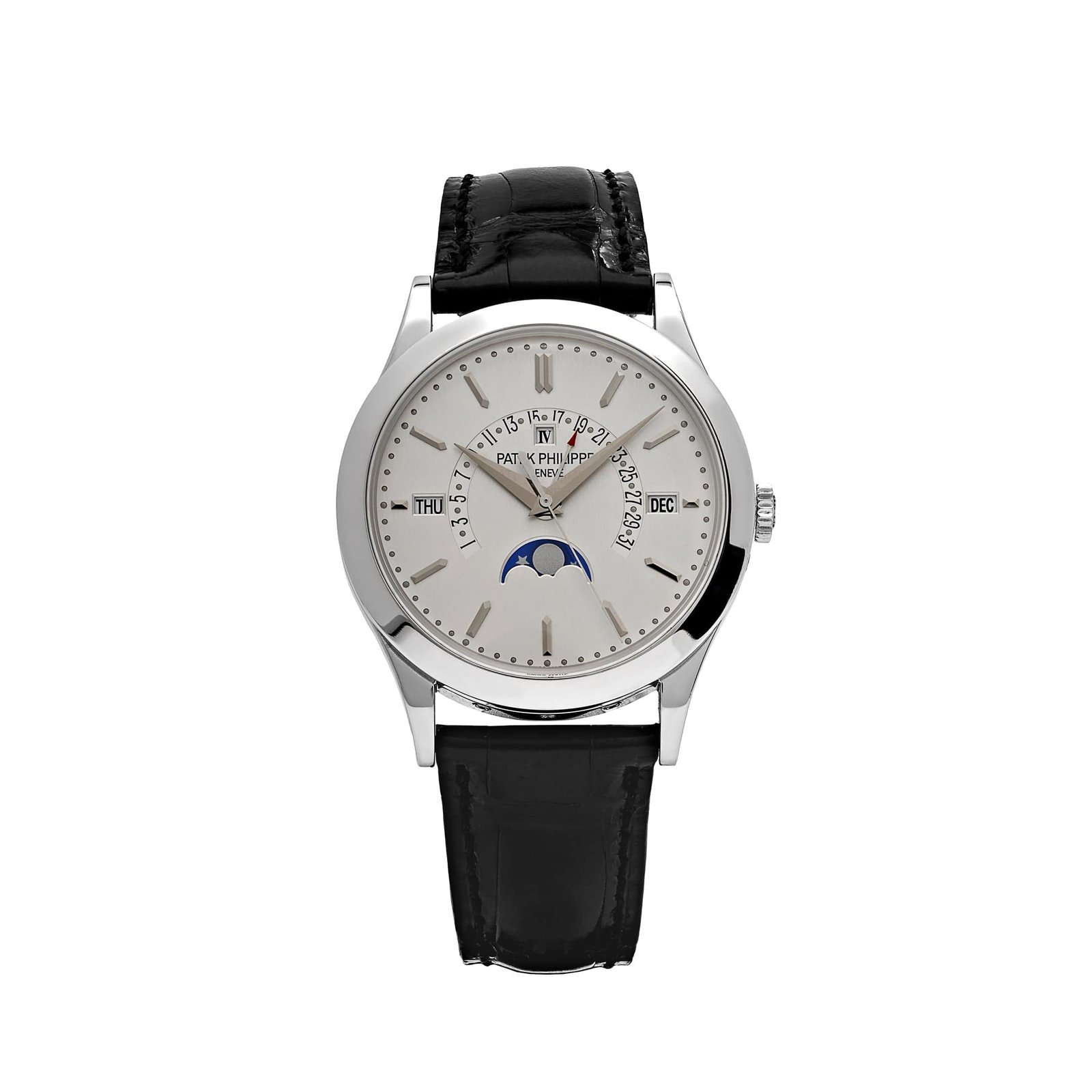 The silvery opaline dial is a harmonious blend of functionality and artistry. It features applied gold hour markers and sleek dauphine hands, ensuring optimal legibility while maintaining a classic aesthetic. The perpetual calendar displays are meticulously arranged, with apertures for the day, month, and leap year, as well as a moonphase indicator and retrograde date display gracefully sweeping across the top half of the dial. These complications are executed with exceptional precision, ensuring the watch remains accurate for decades without manual adjustment.