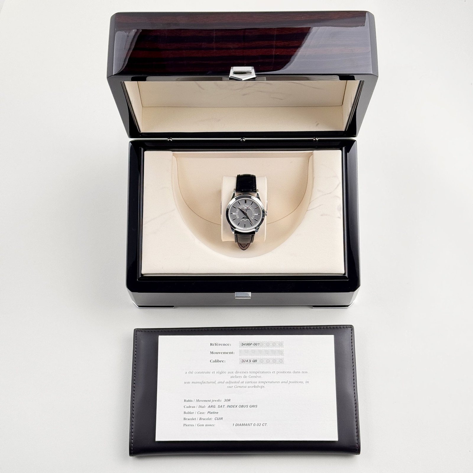 Paired with a hand-stitched alligator leather strap and a platinum fold-over clasp, this timepiece offers unparalleled comfort and sophistication. The Patek Philippe Grand Complications 5496P-001 is a pinnacle of haute horology, perfect for collectors who value timeless elegance, innovative complications, and the enduring legacy of one of the world’s most prestigious watchmakers.