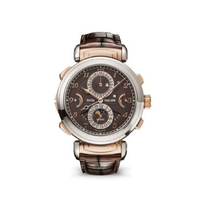 Other features include a date repeater, second time zone with day/night indication, instantaneous perpetual calendar, and moon phases, among others. The dial on the time side features a brown opaline finish with gold applied Breguet numerals and a hand-guilloched hobnail pattern, while the calendar side boasts a matching brown opaline dial. The case of the Grandmaster Chime is a work of art in itself, with a reversible design adorned with a hand-guilloched hobnail pattern. Crafted from a combination of white gold and rose gold, it measures 47.7mm in diameter, commanding attention with its striking presence and intricate detailing.