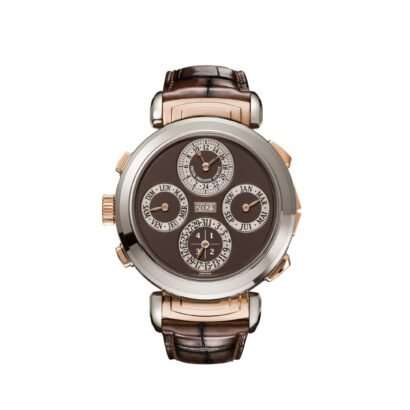 The Patek Philippe Grand Complications Grandmaster Chime 6300GR-001 is a horological masterpiece crafted with meticulous attention to detail and unparalleled complexity. Housed in a 47.7mm case crafted from a combination of rose gold and white gold, this timepiece exudes sophistication and refinement. Paired with a luxurious leather strap, it offers both style and substance in equal measure. At the heart of the watch beats a manually wound mechanical movement, caliber 300 GS AL 36‑750 QIS FUS IRM, renowned for its precision and reliability. This exceptional movement powers a staggering array of over 20 complications, making it one of the most complex timepieces ever created by Patek Philippe. The dual-faced dials of the Grandmaster Chime showcase a symphony of complications, including grande and petite sonnerie, minute repeater, and alarm with time strike.