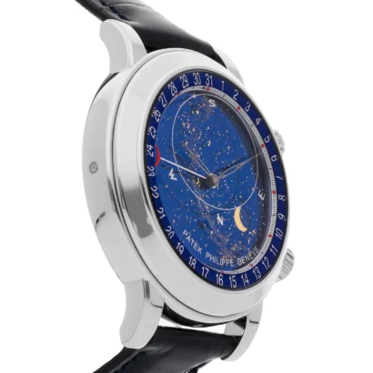 Pre-Owned Patek Philippe Grand Complications Celestial Moon Age (6102P001) self – winding automatic watch, features a 44mm platinum case surrounding a blue Sky Chart dial on a blue leather strap with a platinum Calatrava Cross deployant buckle. Functions include hours, minutes, seconds, date, sky chart, phases and Orbit of the moon. This watch comes complete with the original box and papers. We back this watch with a 2-Year warranty by The 1916 Company!