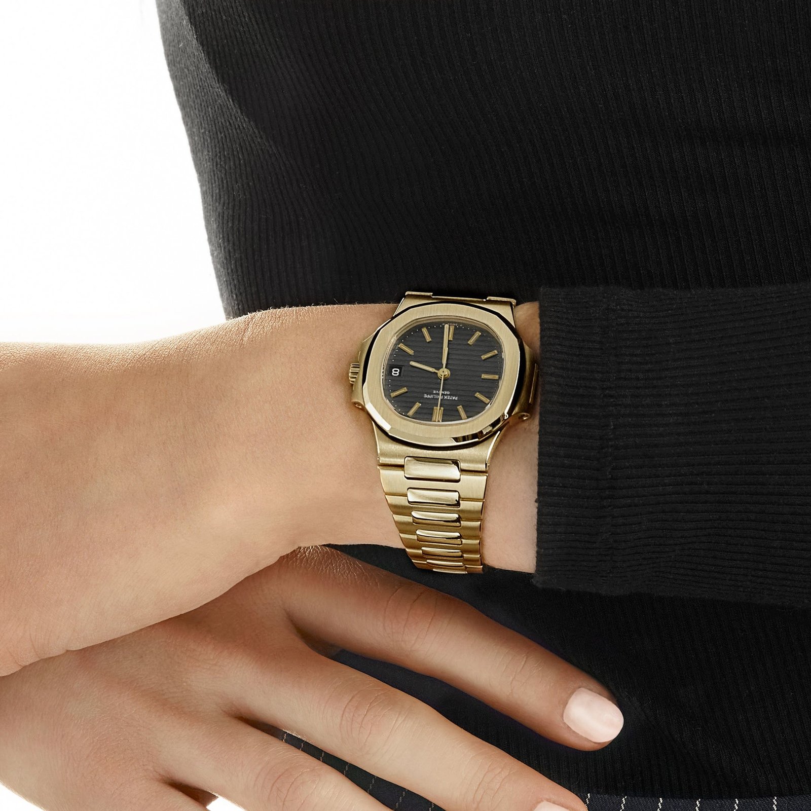 The bold blue dial, adorned with the Nautilus’s signature horizontal embossing, provides a striking contrast against the warm glow of the 18k yellow gold case and integrated bracelet. The gold applied hour markers, filled with luminous material, ensure optimal readability, while the classic date window at 3 o’clock adds practical functionality. The slim bezel and refined case architecture enhance the watch’s elegant yet sporty character.