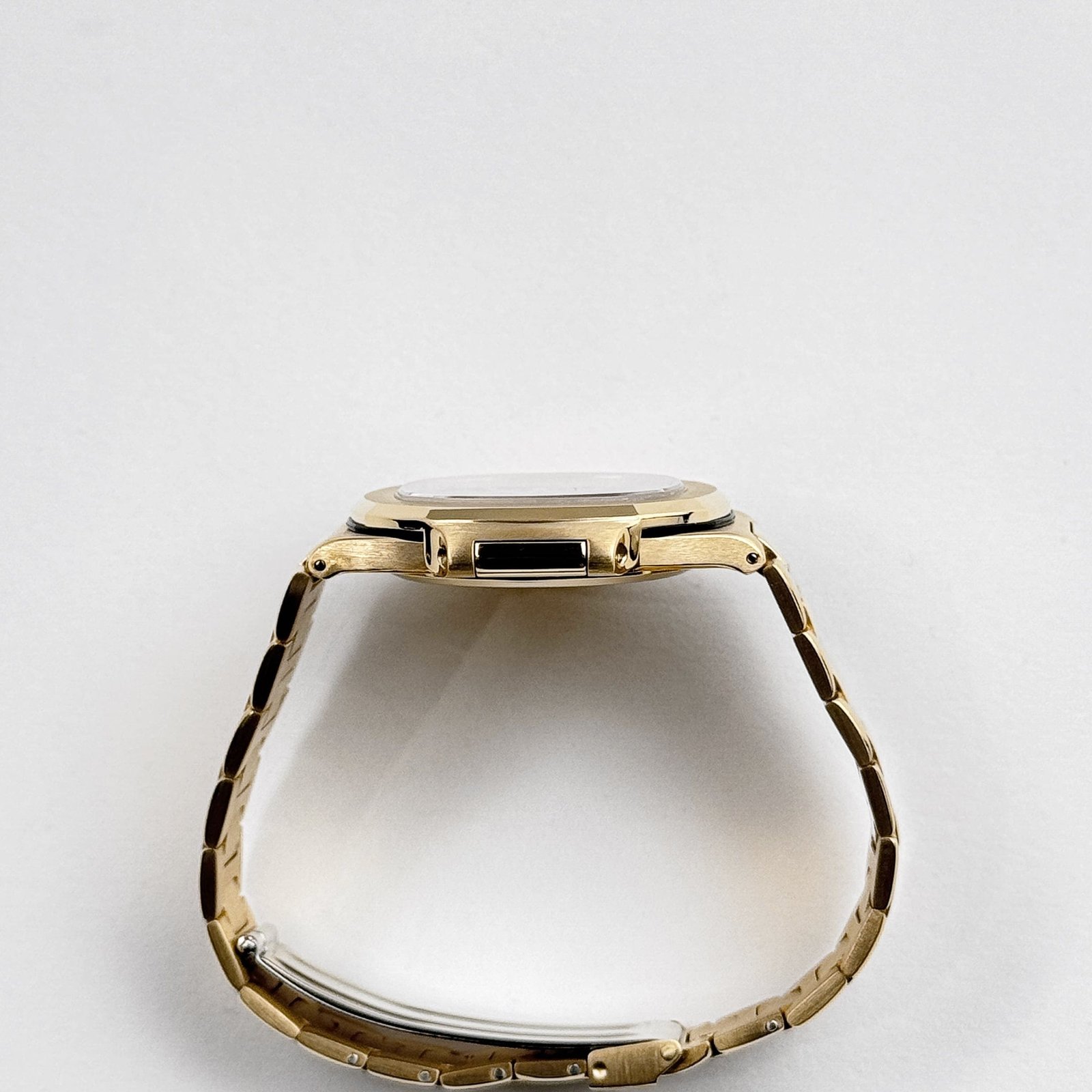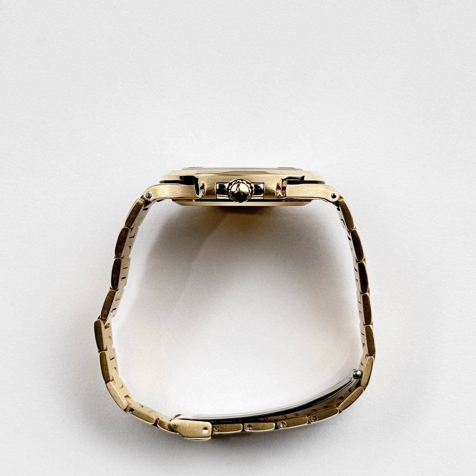 The integrated yellow gold bracelet with a fold-over clasp offers a seamless, luxurious fit on the wrist.