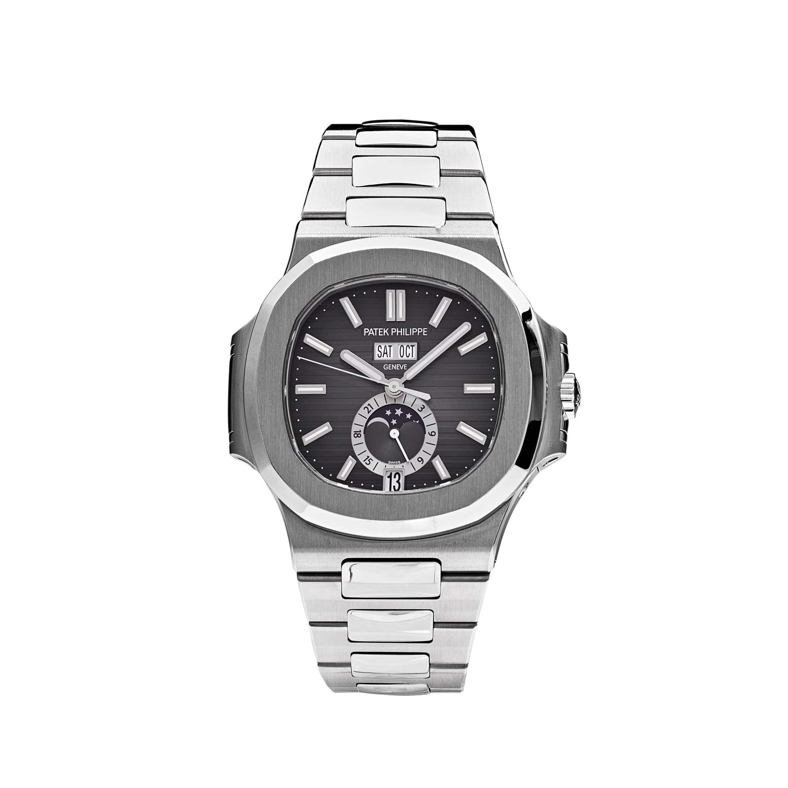 Elevate your wristwear collection with the Patek Philippe Nautilus Annual Calendar Moon Phase 5726/1A-001, a timepiece that seamlessly merges classic design with modern functionality. Crafted by one of the most revered names in horology, this watch is a testament to Patek Philippe’s commitment to precision and elegance. The stainless steel case boasts the iconic Nautilus design, with its distinct porthole-inspired shape and a combination of brushed and polished finishes. This harmonious fusion of elements creates a watch that effortlessly exudes a sporty yet refined aura. The gradient grey dial is a canvas of sophistication, enhanced by the luminous applied hour markers and hands. A harmonious blend of functionality and aesthetics, the watch displays the day, date, and month through apertures, with the moon phase indicator adding a touch of celestial charm.